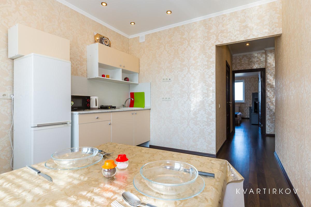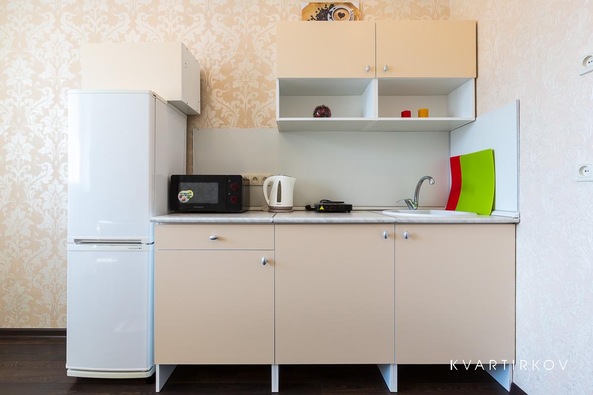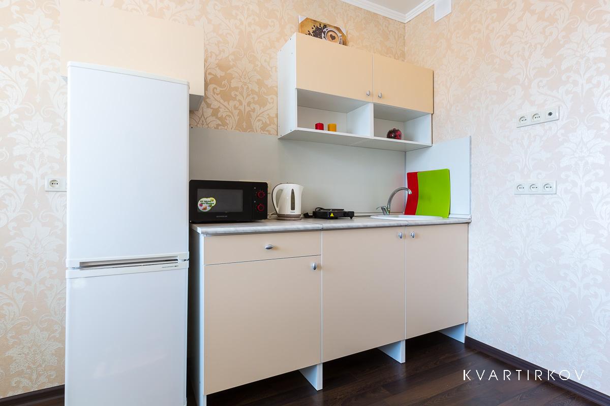 В квартире находиться мягкий диван. На кухне имеется все необходимое для приготовления пищи: электрический чайник, плита, микроволновая печь, холодильник.