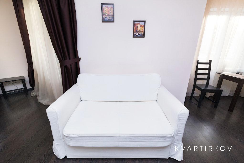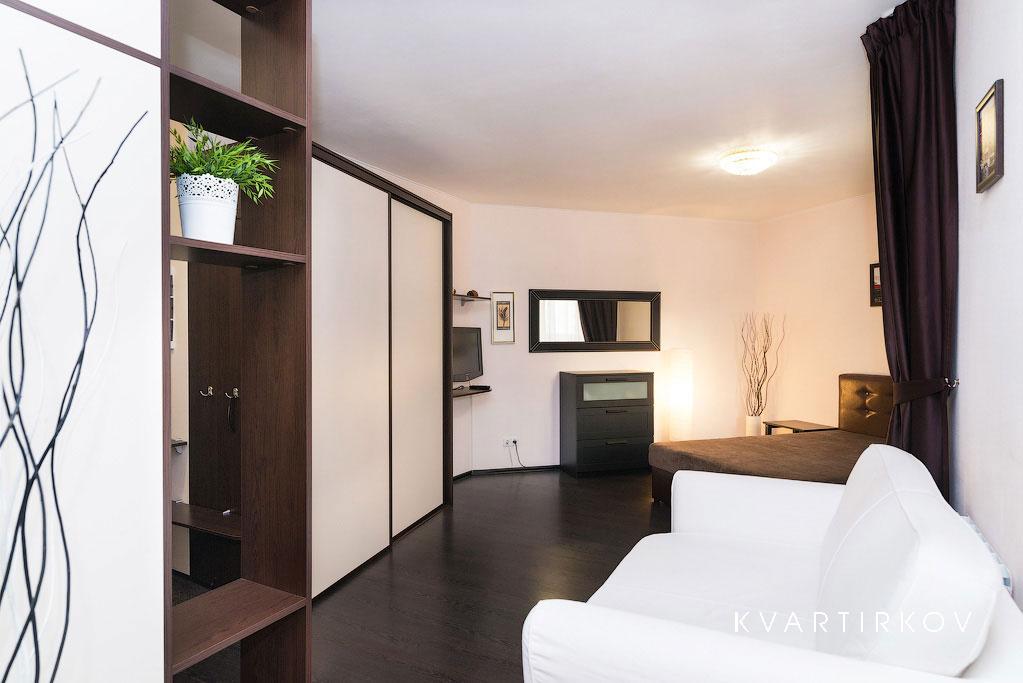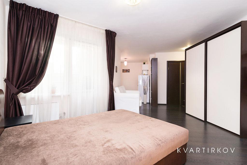 Daily and hourly surrenders luxury studio apartment located in the heart of the city at the address. Federal, 2. Nearby are major thoroughfares, metro station - "Chkalov", as well as the Southern Bus Terminal. The apartment is renovated in the style of hi-tech! Chic brown bed, countertops direct forms, bright lights, mirrors - can make your stay in the apartment is not only comfortable, but also of the exquisite.