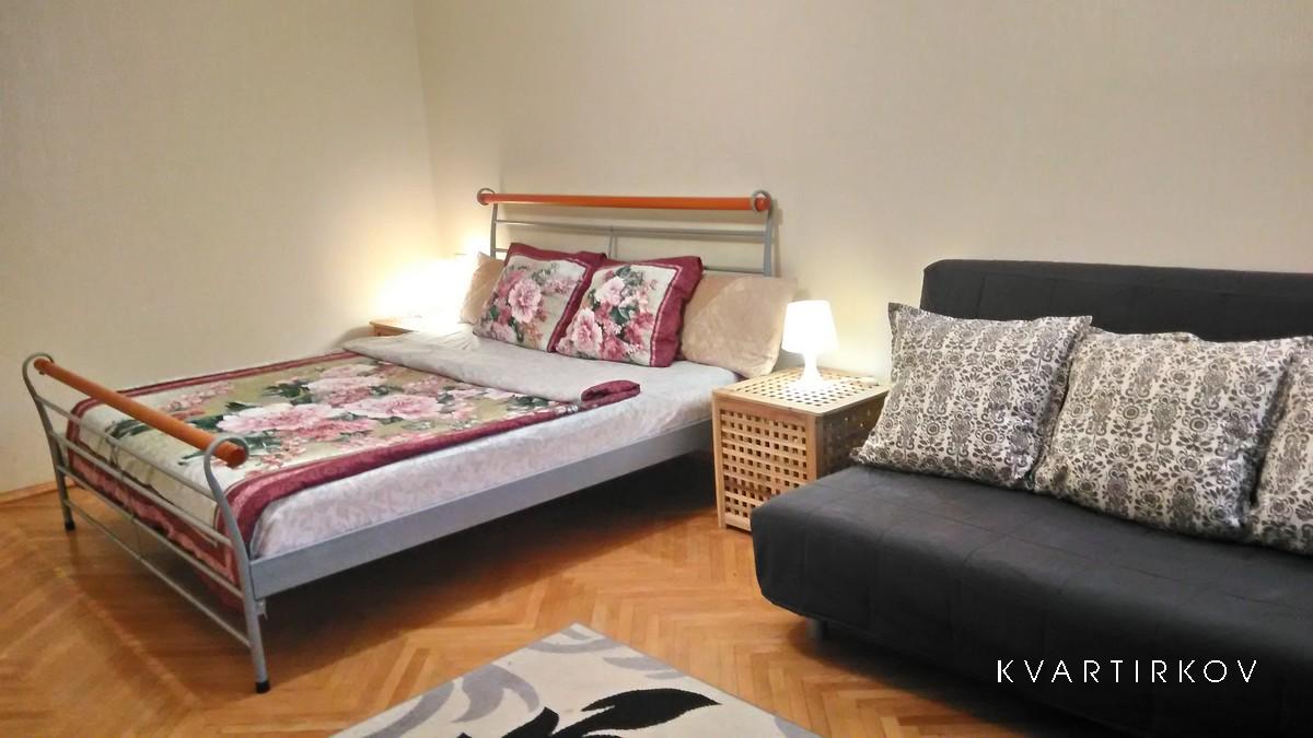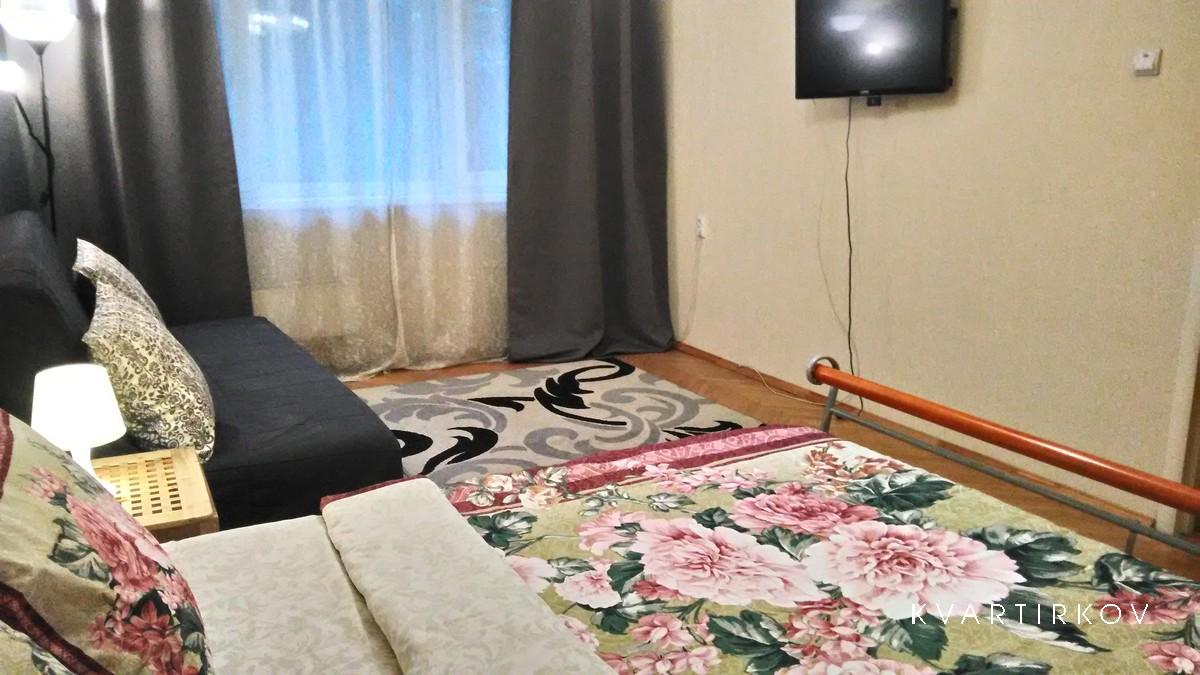Rent an apartment for daily rent with quality repairs in 7 minutes walk from the subway South-Western. Number of beds 4 (2 + 2). The apartment has everything you need for a comfortable stay: a double bed, double sofa, electric stove, all necessary utensils for cooking and eating. From household appliances: air conditioning, TV, refrigerator, washing machine, electric kettle, microwave, hair dryer, iron and ironing board.