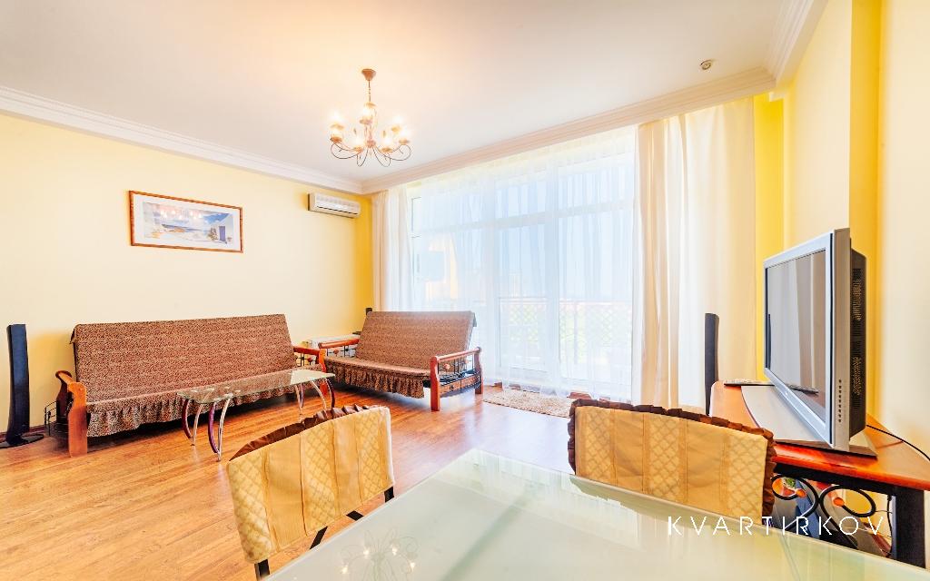 Modern studio apartment in a luxury residential complex "Arcadia Palace" on the beach. Total 6 places for guests - a large double bed in a separate bedroom, sofa and armchair in the living room. Large terrace with furniture for outdoor recreation and stunning sea views. There are all necessary for comfortable living - modern appliances, new furniture, panoramic windows, autonomous system of water and heat supply, always clean and fresh bed linen, towels, dishes.