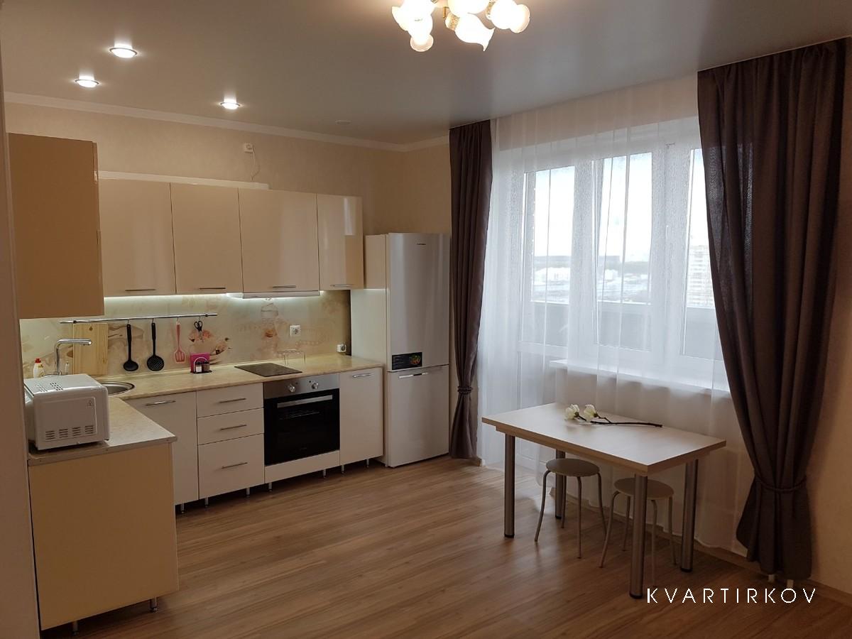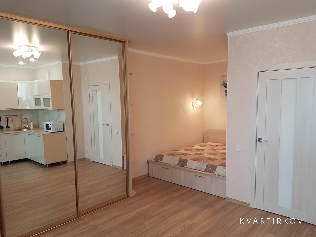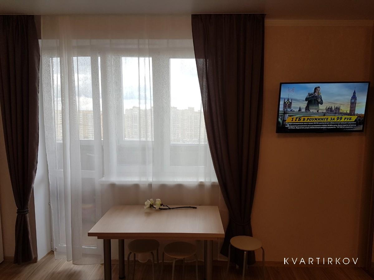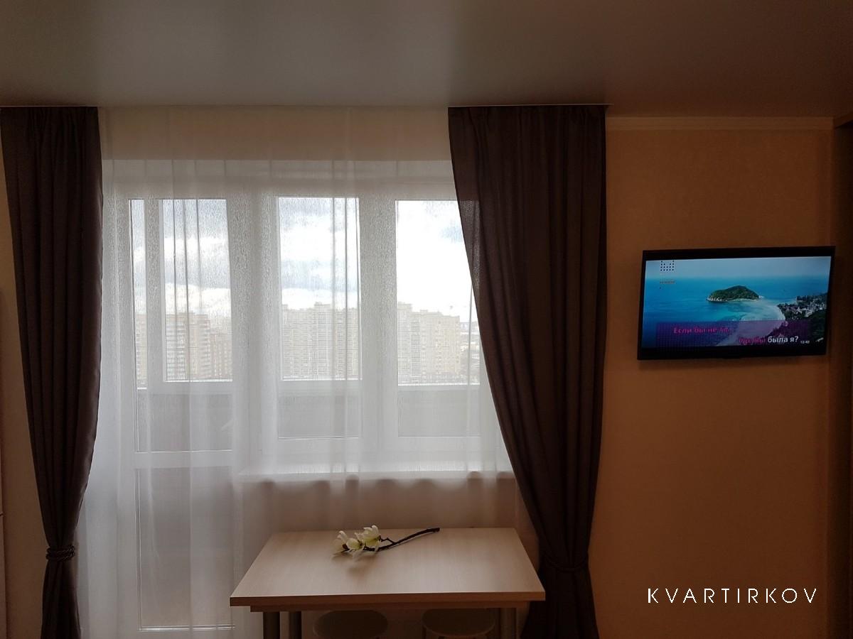 For rent studio apartment in a new building. New house with beautiful grounds. Convenient transport interchange exit on the bypass road 2 minutes. 15 minutes drive to the airport 10 min. to the railway station, 5 min. to Patrushevo (medical center for neurosurgery), 7min. to the Cardiocenter. Within walking distance of the Kristall mall, Leroy Merlin, Auchan, Lenta, Metro.