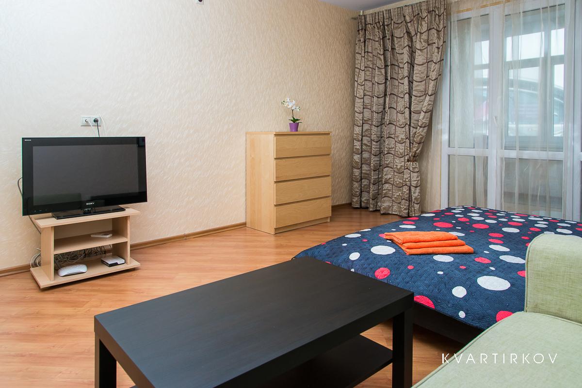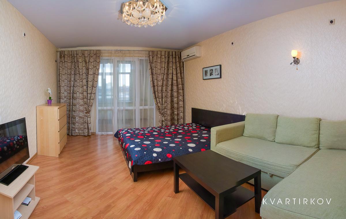 Светлая, уютная, просторная студия укомплектована современной мебелью и бытовой техникой для комфортного проживания. На кухне есть удобный кухонный гарнитур, обеденный стол, стулья, холодильник, микроволновая печь, электрический чайник и столовая посуда в полном комплекте. В гостиной двуспальный раскладной диван, двуспальная кровать, жидкокристаллический телевизор, кабельное телевидение, высокоскоростной Wi-Fi, кондиционер.