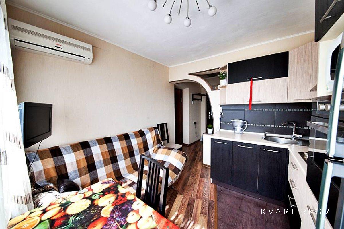 Новая мебель, большой шкаф купе, вся бытовая техника, две сплит системы на кухне и в зале, плазменный ТВ 42 диагональ с DVD плеером, на кухне ТВ ЖК 26 диагональ со встроенным DVD, (есть отличная коллекция фильмов), новый холодильник, стиральная машина, микроволновка, мощный фен, новый утюг, гладильная доска.