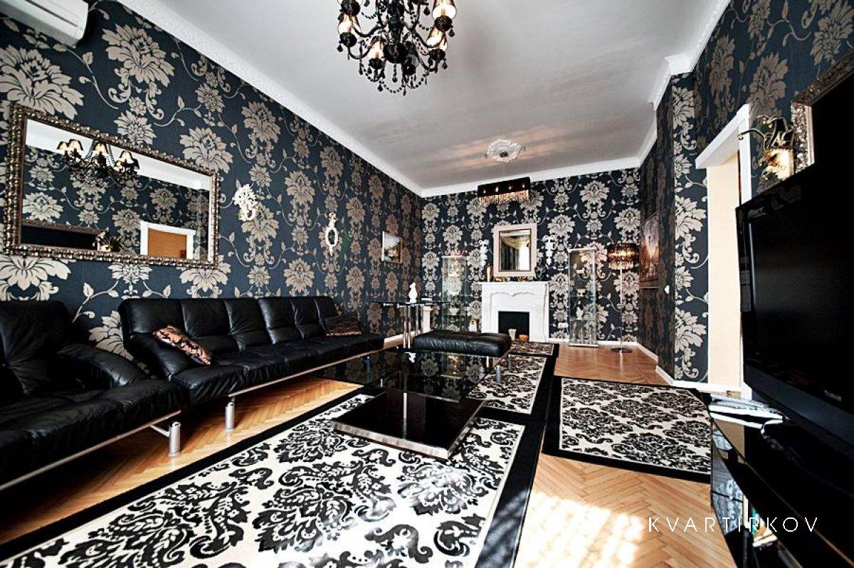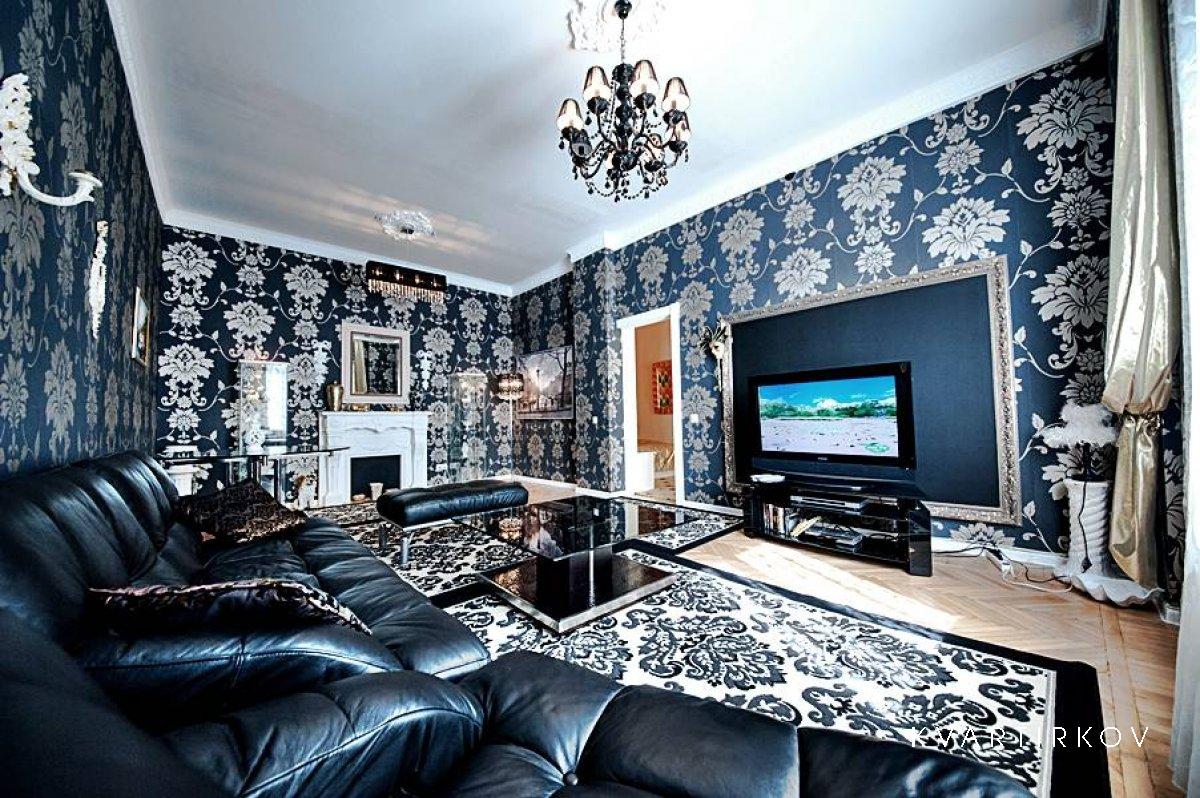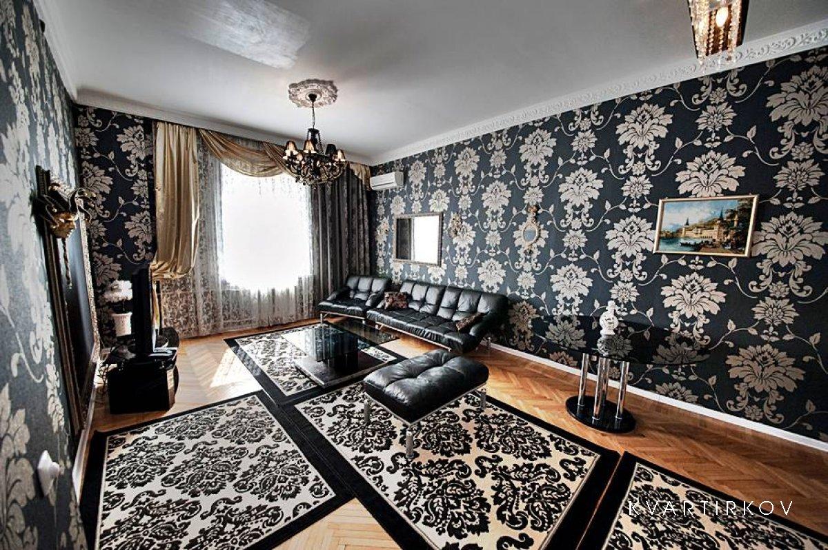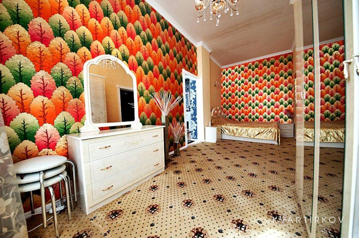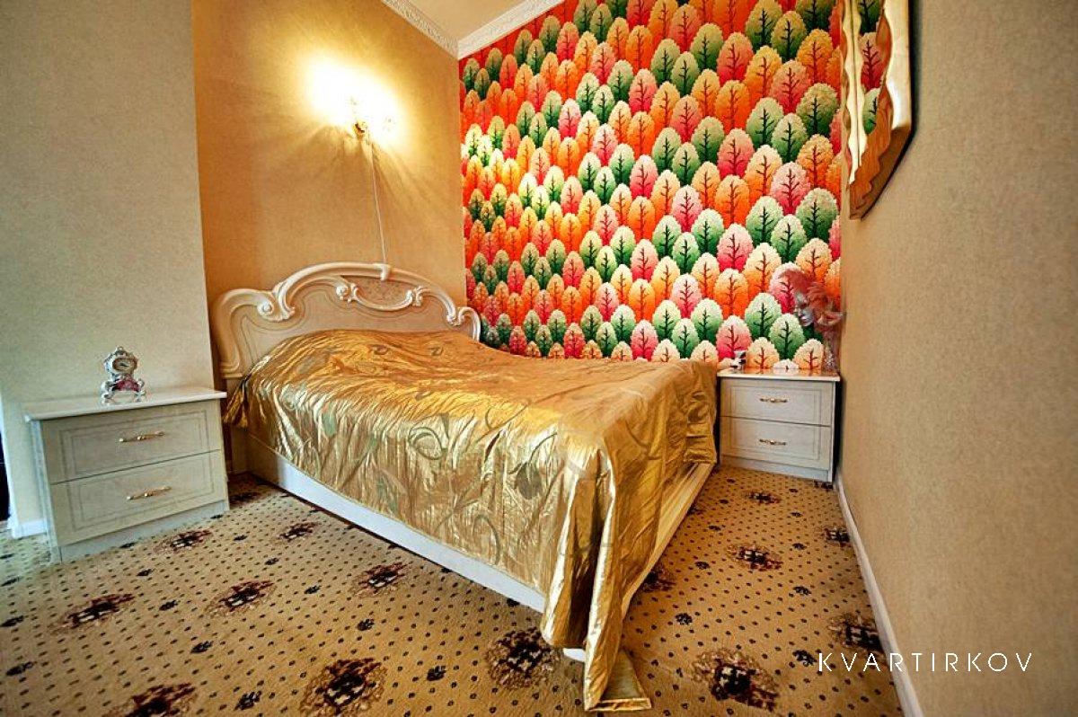 Евроремонт, в спальне двуспальная кровать, большой шкаф, шикарный зал с изысканным интерьером, кожаный диван, кресло, банкетка, журнальный столик,