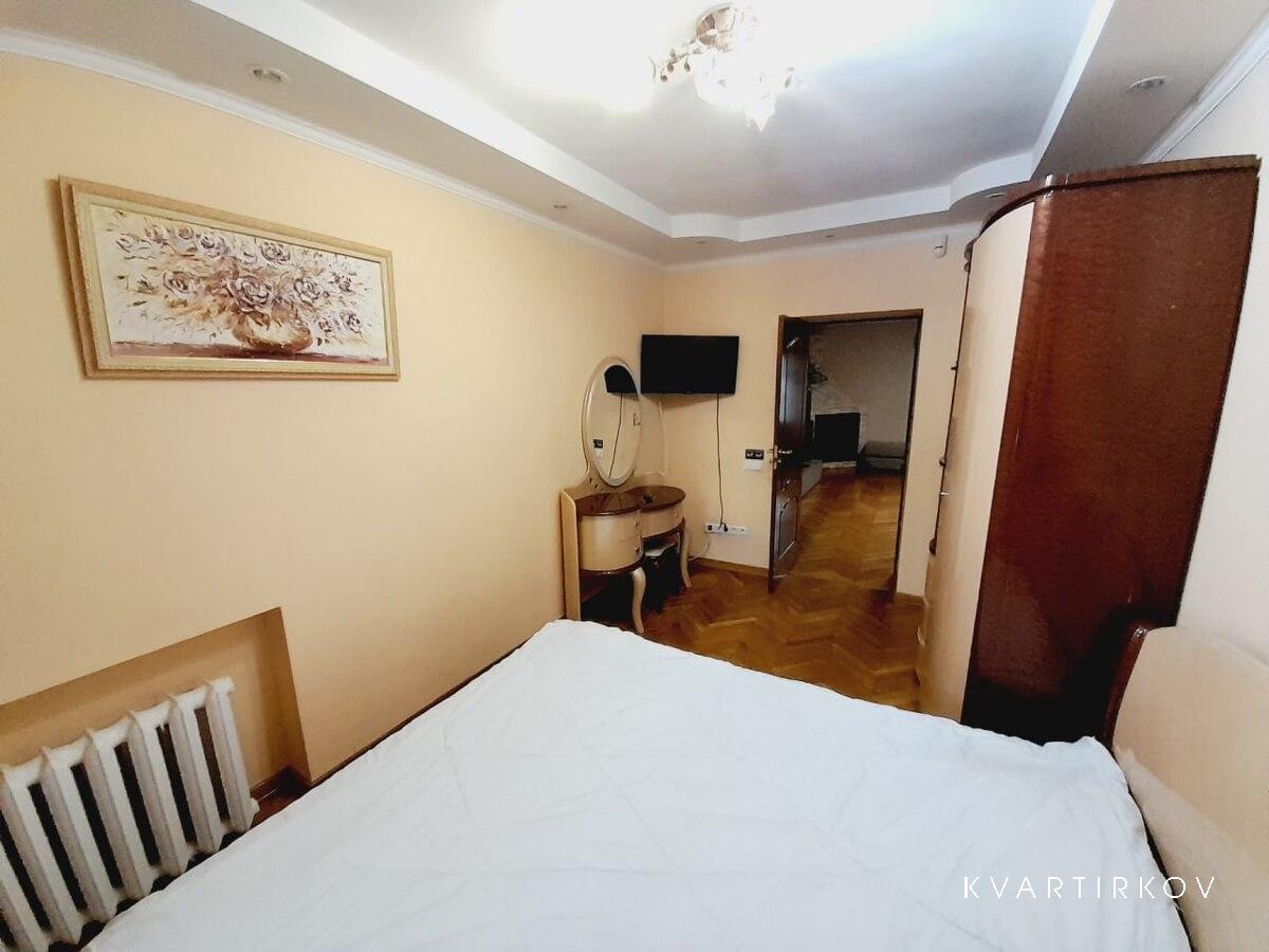 В спальні розташовані двоспальне ліжко, шафа, туалетний столик та телевізор