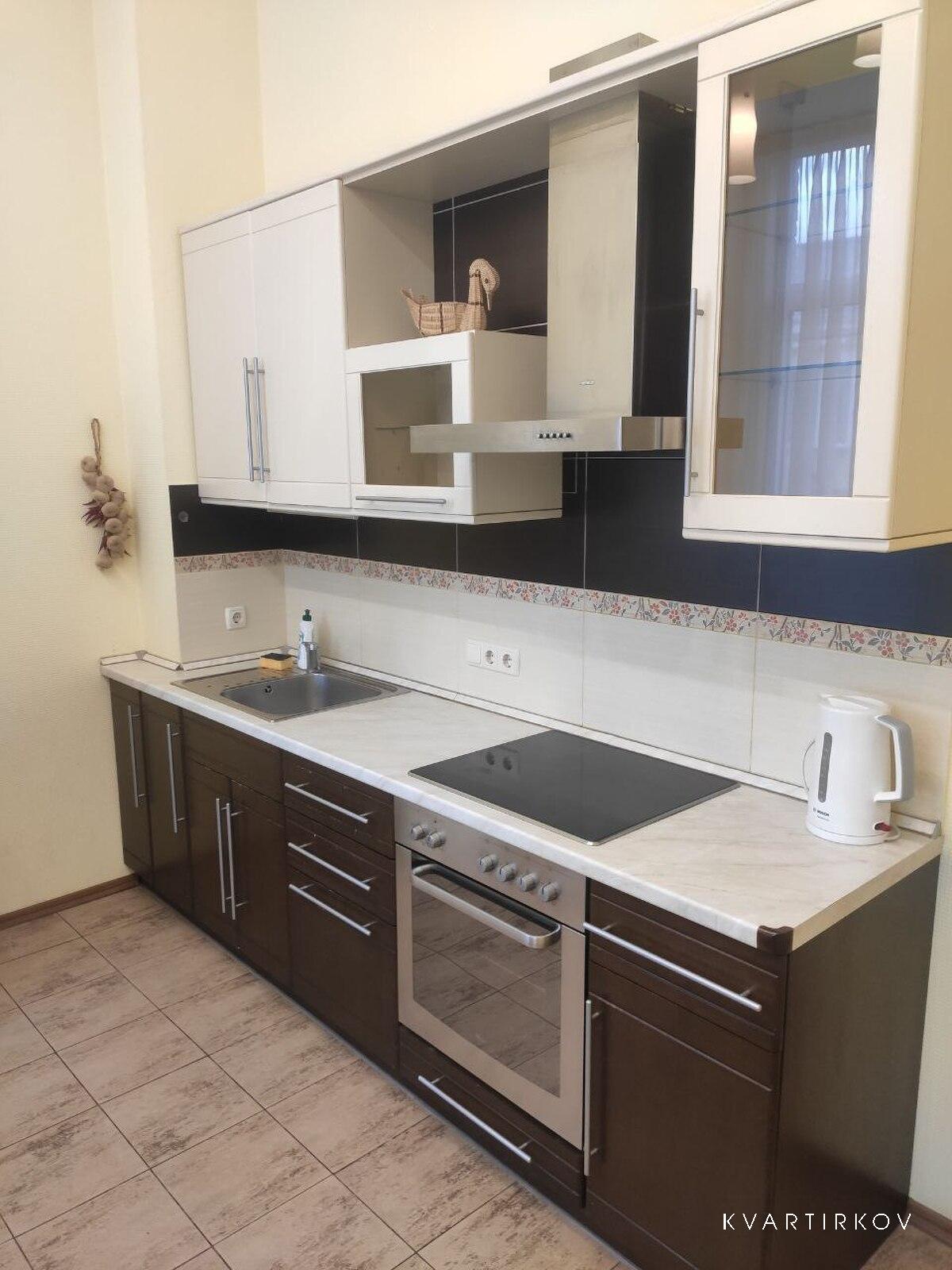Кухня переважно у світлих тонах з меблевим гарнітуром коричневого кольору. Є зручна обідня зона зі столом та стільцями. Є необхідна побутова техніка для комфортного проживання: холодильник, електрична плита, духовка, витяжка, електричний чайник, мікрохвильова піч.