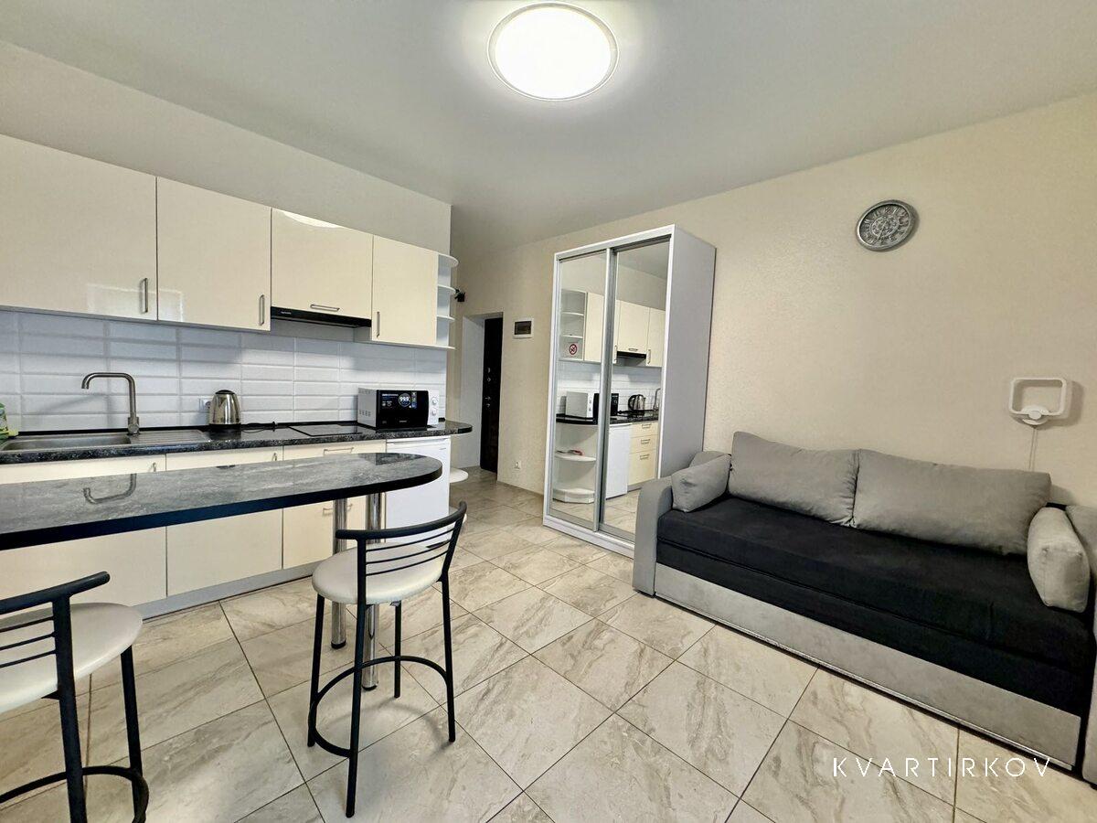 Квартира-студія з сучасним ремонтом, виконана у світлих тонах з кольоровими акцентами та комфортними меблями.