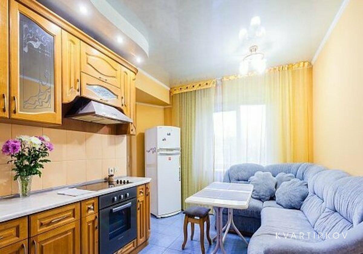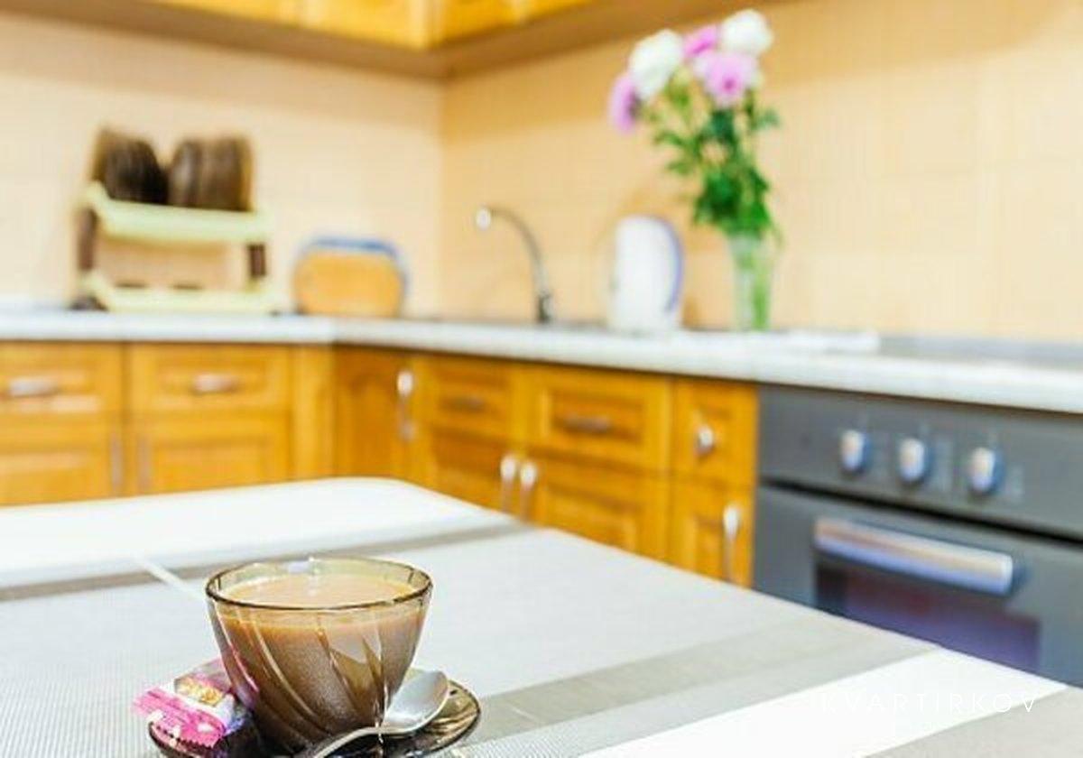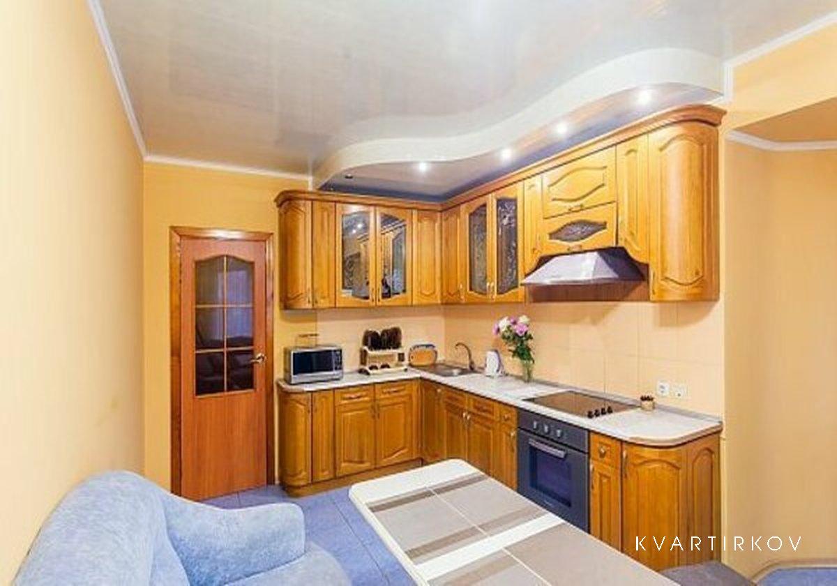 Также имеется встроеная кухня из натурального дерева, вся необходимая техника, посуда, столовые приборы.