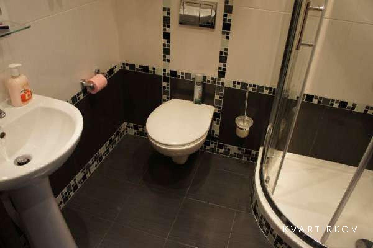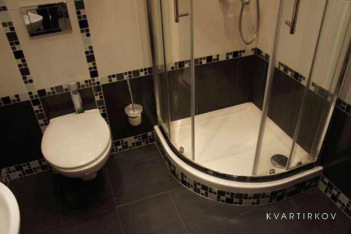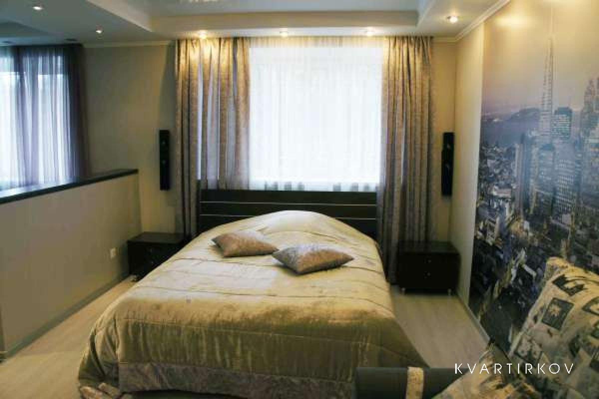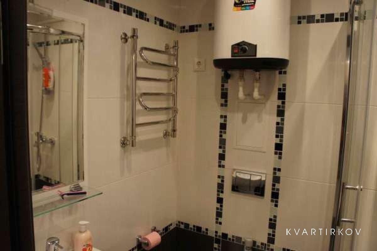 В спальне расположена большая двуспальная кровать и раскладной диван. Телевизор, DVD, музыкальный центр. Имеется утюг и гладильная доска. Санузел совмещенный, с душевой кабиной. Кухонный гарнитур, микроволновая печь, холодильник, плита.
