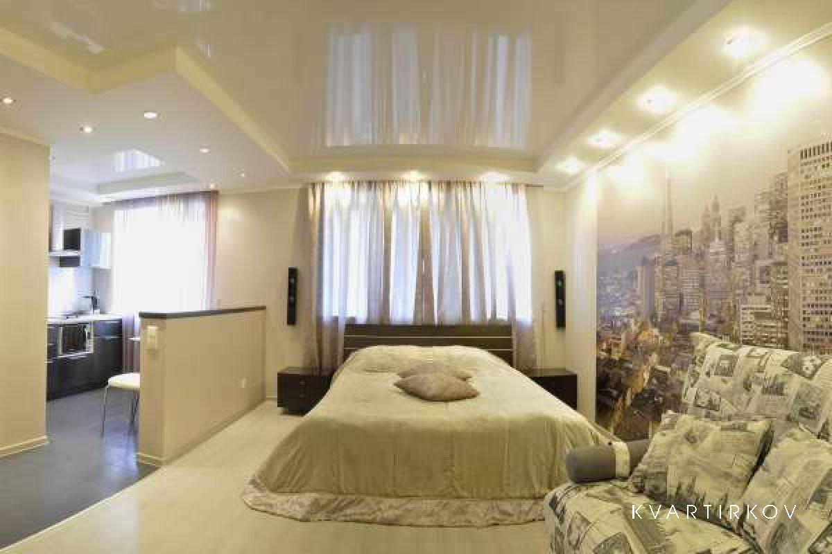 Планировка квартиры выполнена в виде студии с общим пространством комнаты и кухни.