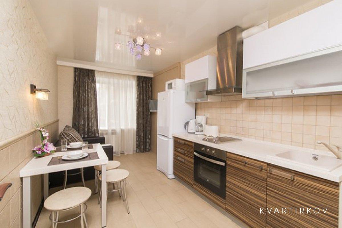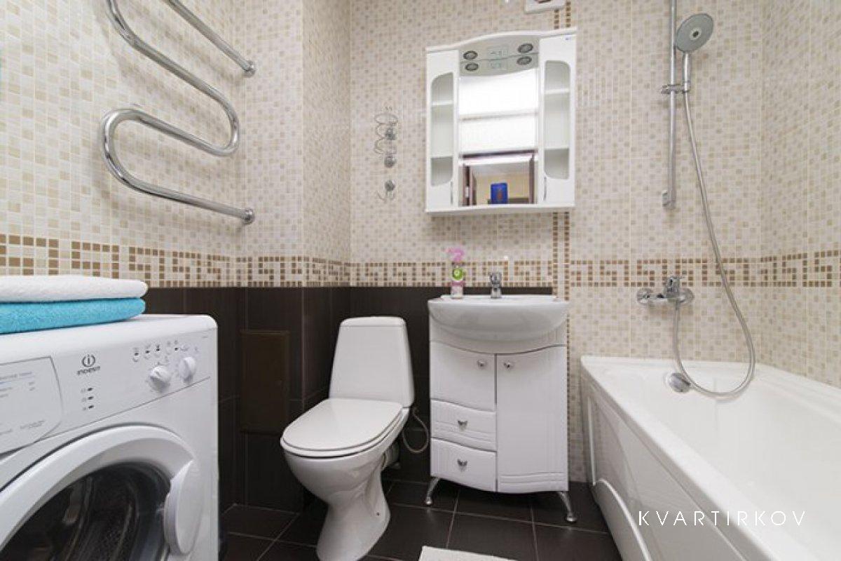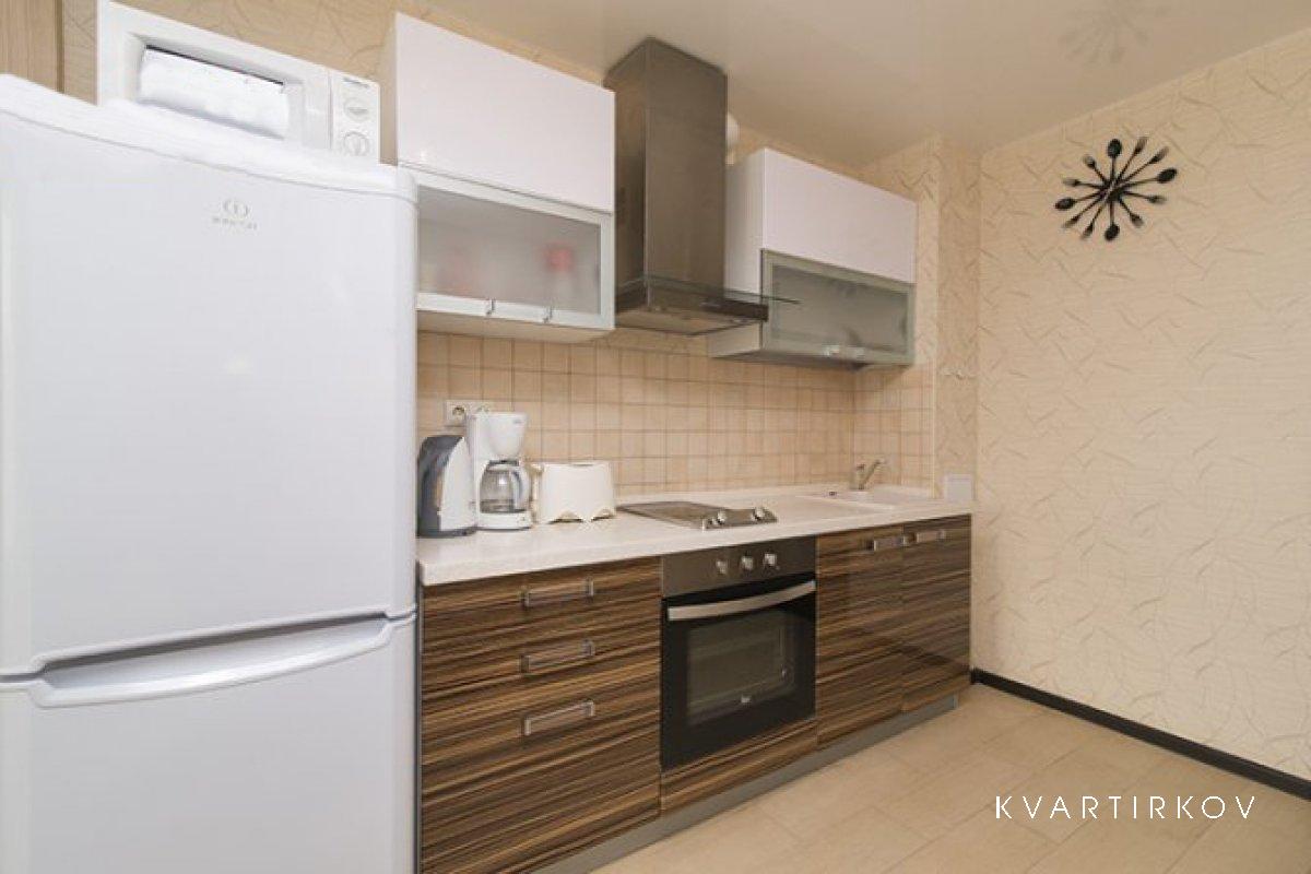 Квартира полностью укомплектована бытовой техникой: телевизором, холодильником, электрической плитой, СВЧ-печью, электрическим чайником, стиральной машиной, феном, утюгом и гладильной доской.