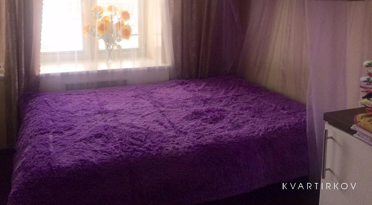Без комиссии и залога сдается посуточно тихая и уютная однокомнатная квартира с двумя широкими диванами. Окна выходят во двор. Шкафы, стулья, кухня, телевизор, безлимитный интернет. Санузел раздельный, ванна. Есть застекленный балкон. Предоставляется постельное бельё и полотенца, душевые принадлежности, фен, утюг, а также бесплатный чай, кофе.