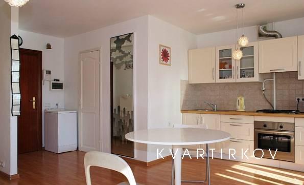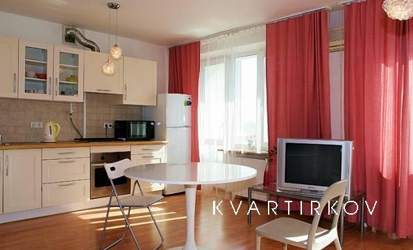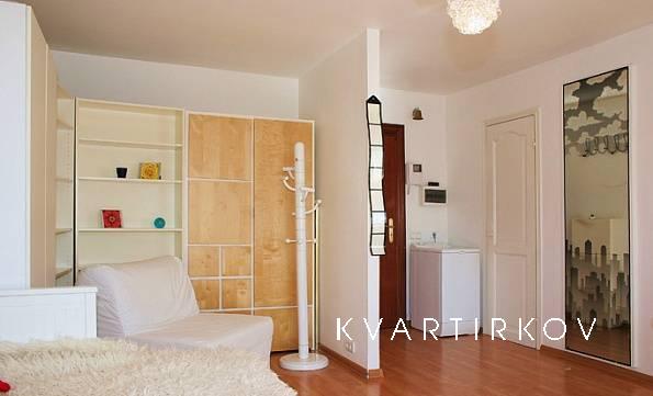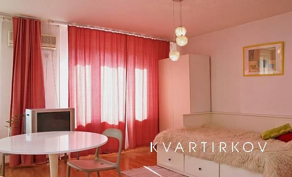 Квартира-студия (бизнес-класс) после евроремонта. Вся необходимая мебель и бытовая техника (2-хспальная кровать, кресло-кровать,кондиционер, телевизор, холодильник, стиральная машинка-автомат, плита,фен, утюг, гладильная доска, электрический чайник).Есть балкон Предоставляется постельное белье, полотенце, посуда. Интернет Wi-Fi.