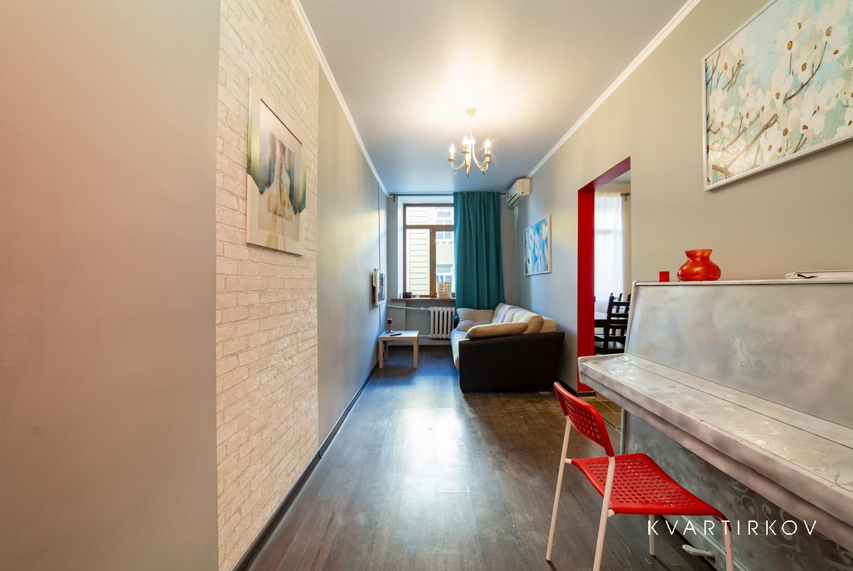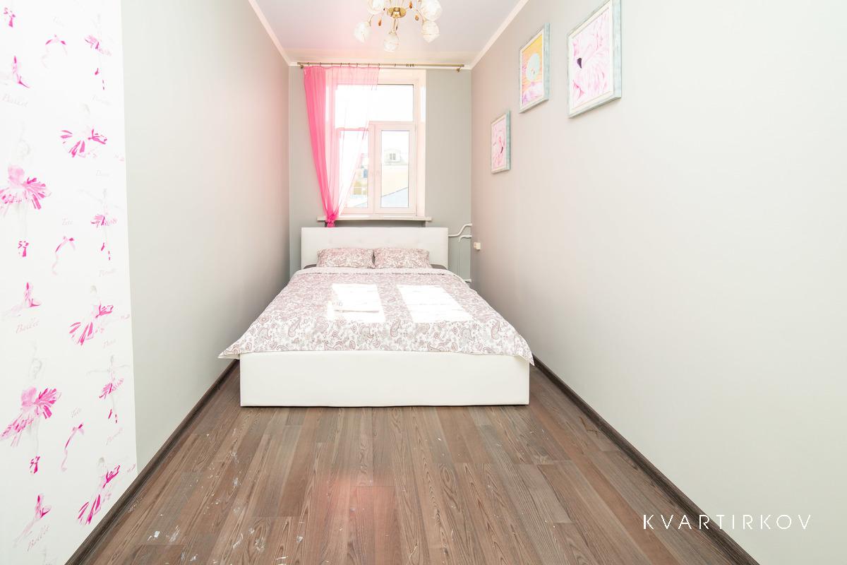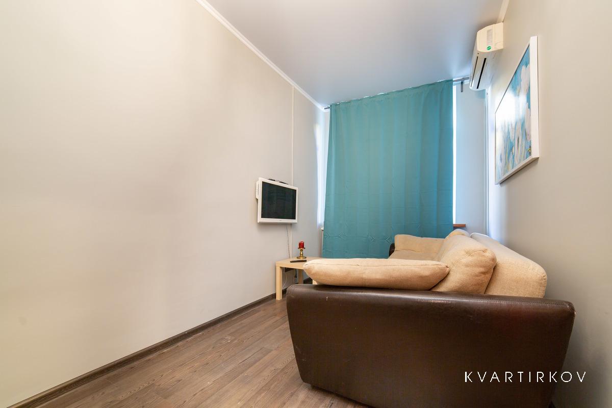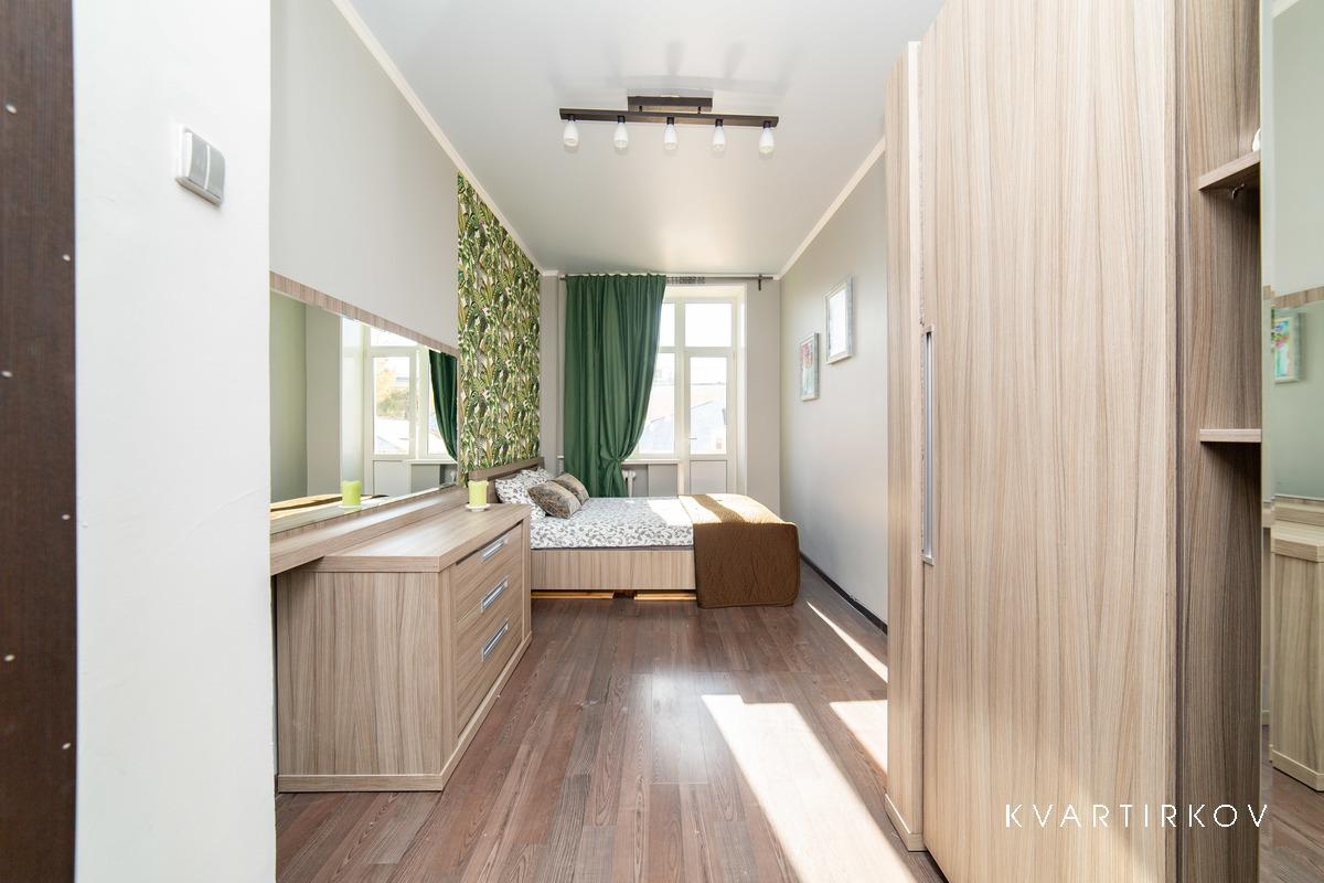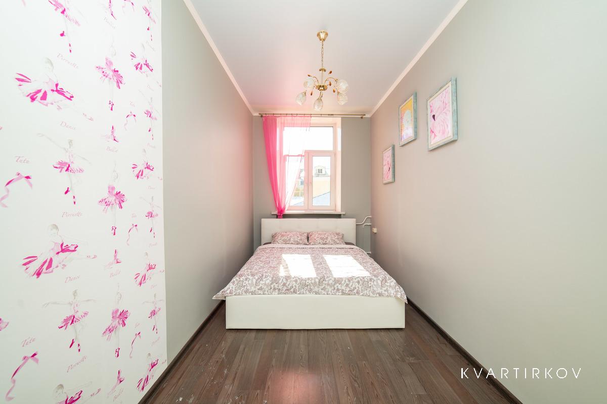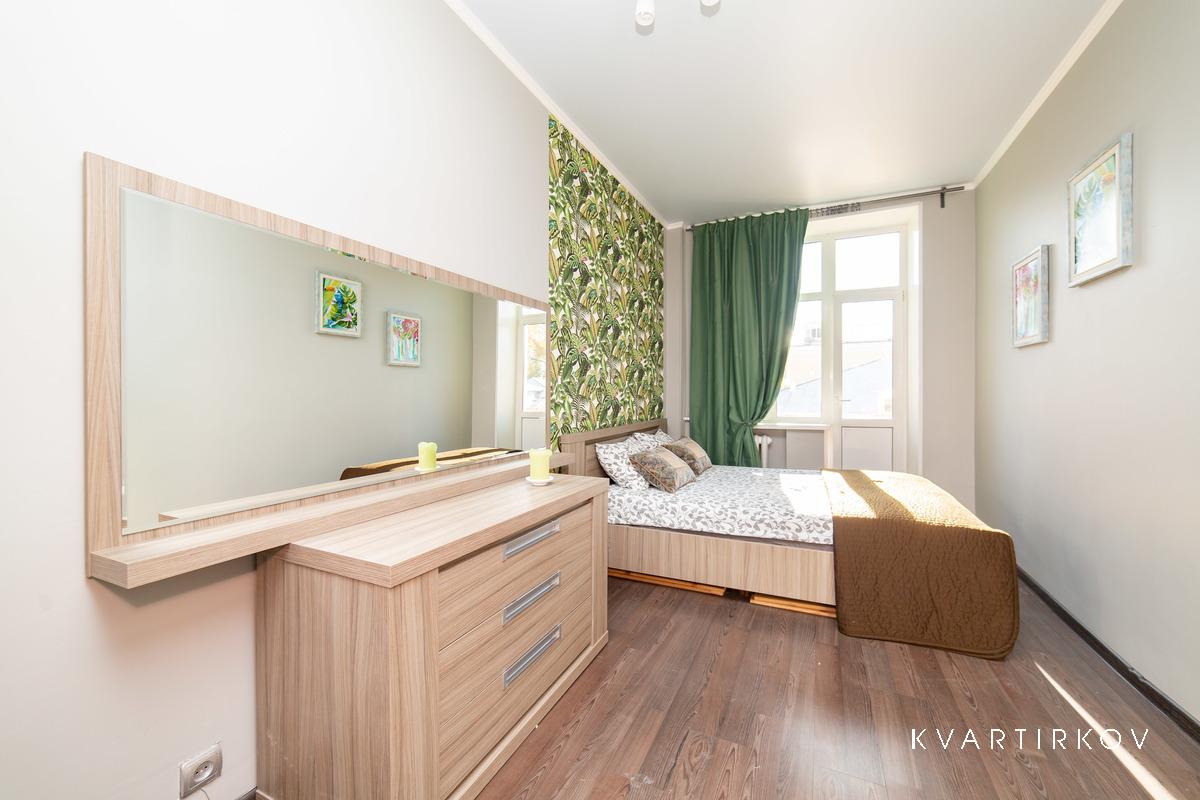Квартира находится в старинном здании на 3 этаже (есть лифт). В подъезде ведется видеонаблюдение. Это небольшая, но очень уютная, с высокими потолками, только что полностью отремонтированная квартира в современном минималистском стиле. В спальне есть двуспальная кровать, шкаф-купе, комод с зеркалом и выход на балкон.