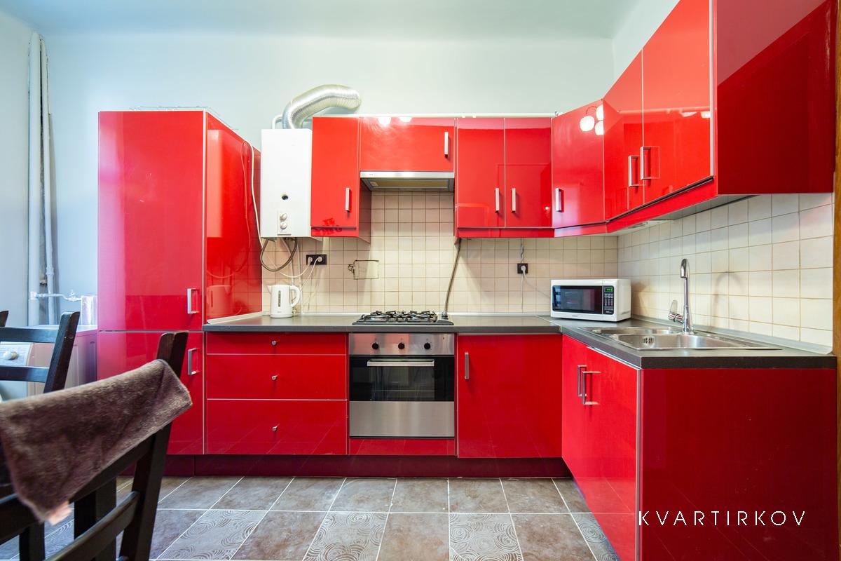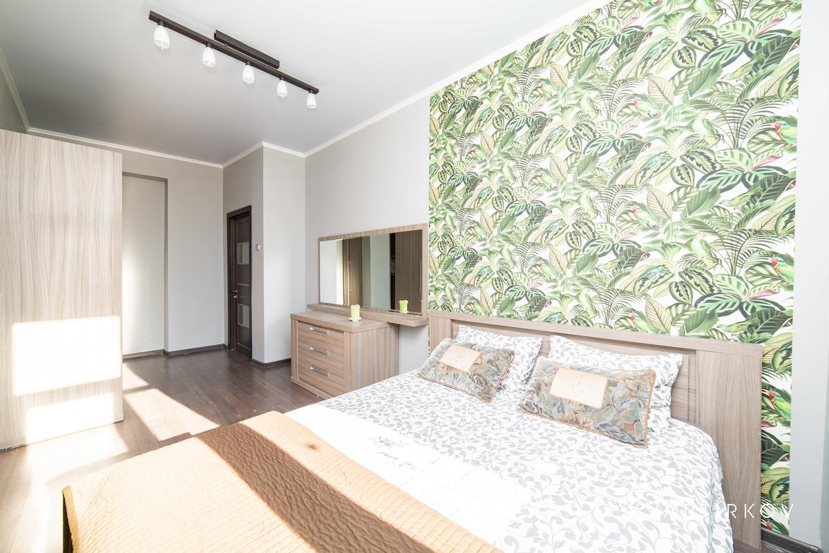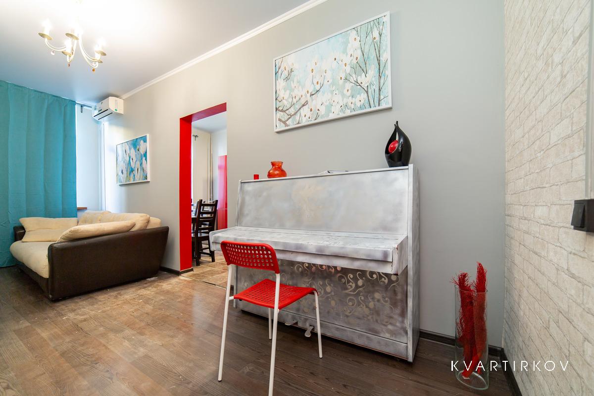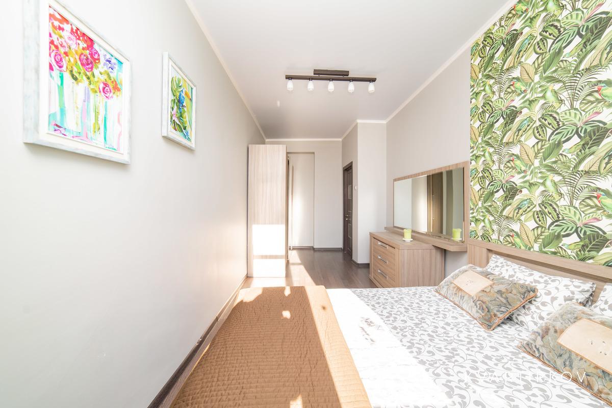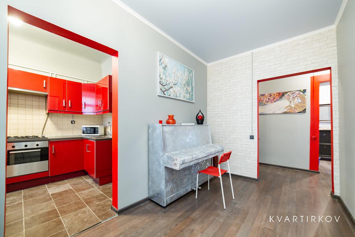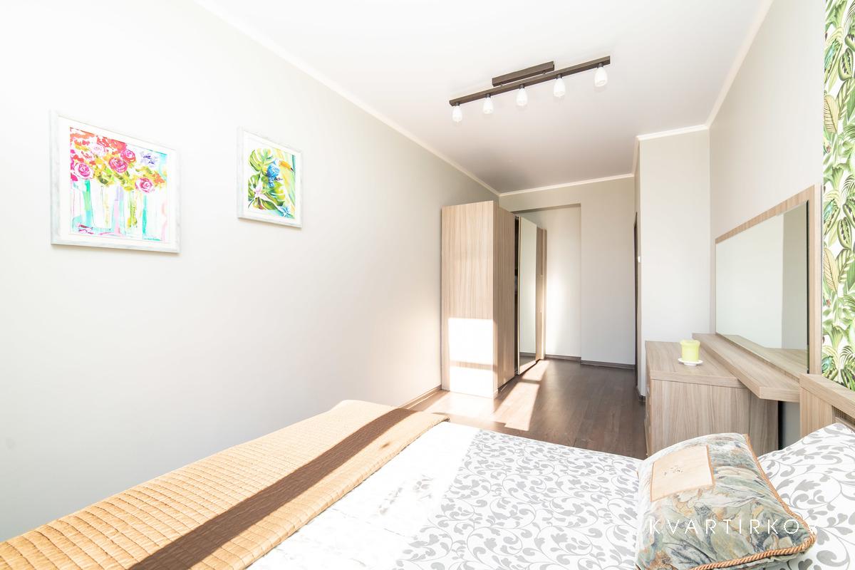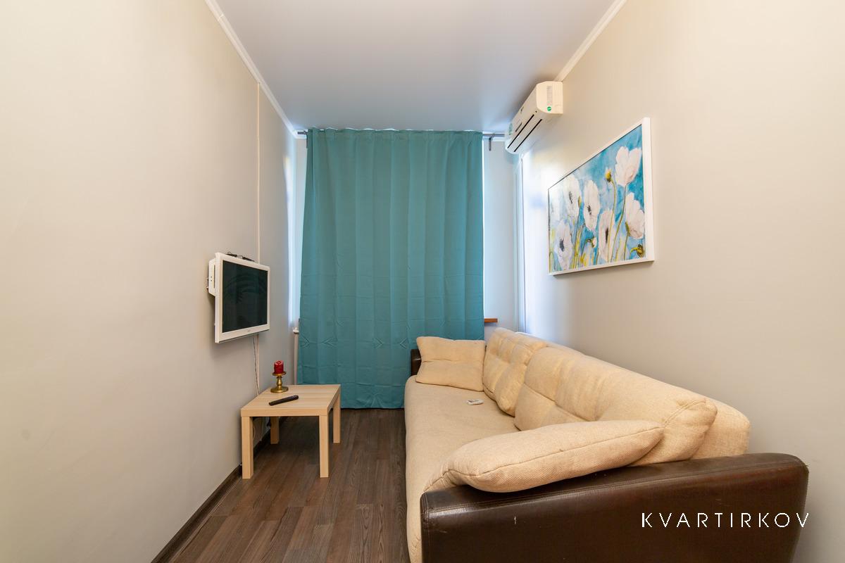 Квартира находится в старинном здании на 3 этаже (есть лифт). В подъезде ведется видеонаблюдение. Это небольшая, но очень уютная, с высокими потолками, только что полностью отремонтированная квартира в современном минималистском стиле. В спальне есть двуспальная кровать, шкаф-купе, комод с зеркалом и выход на балкон.