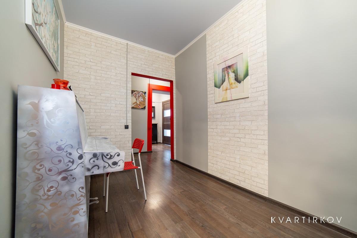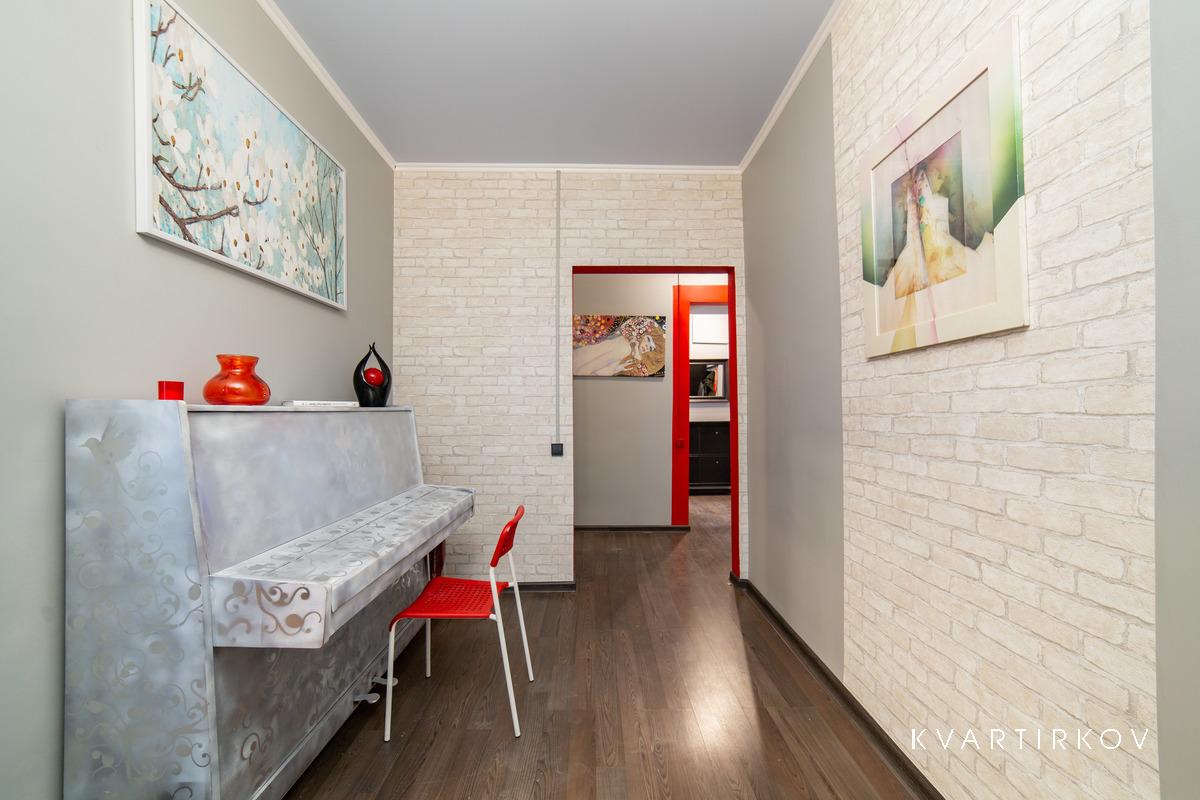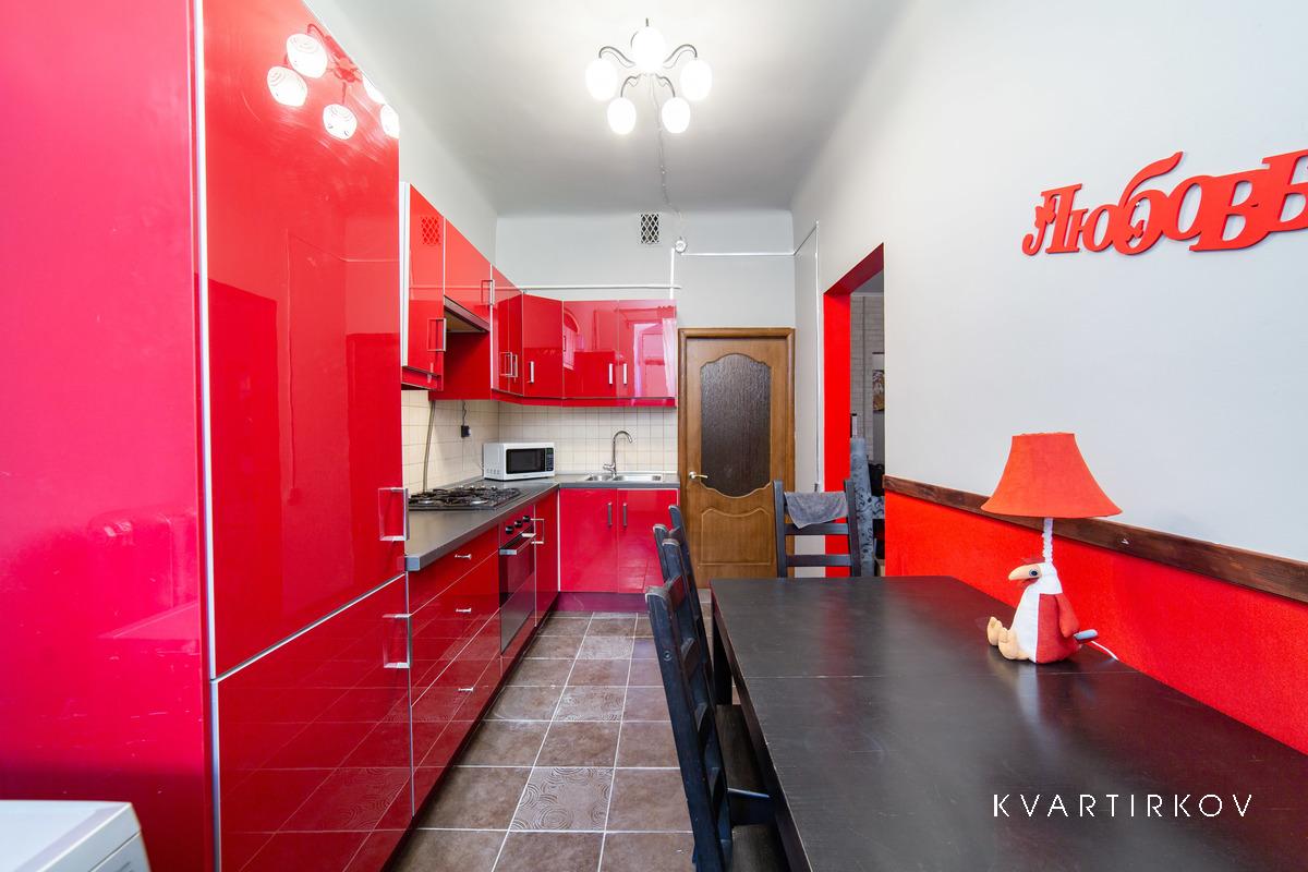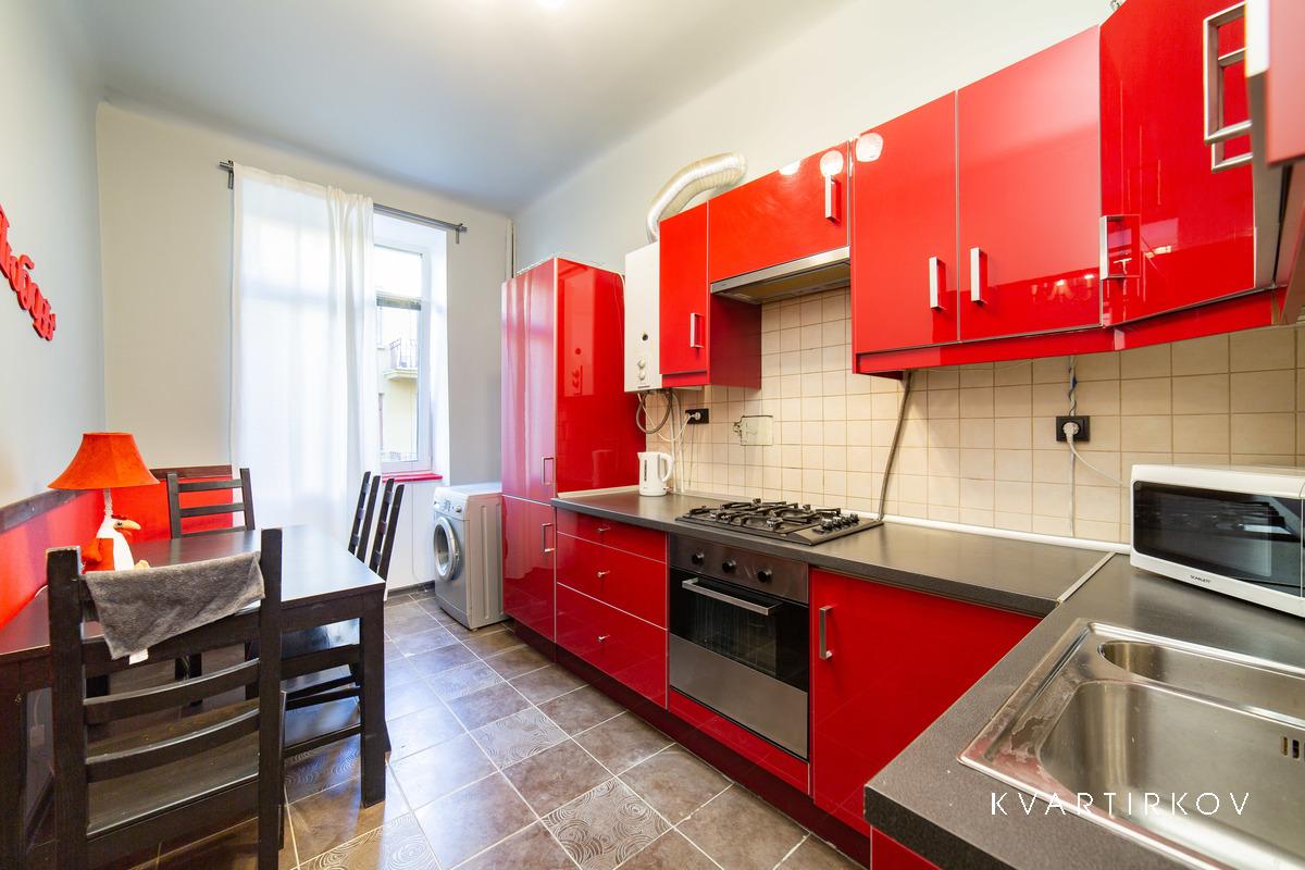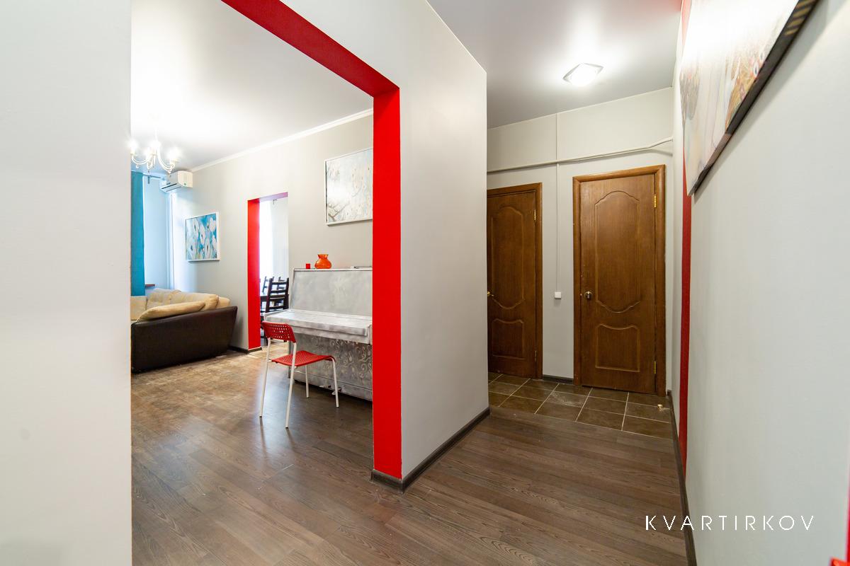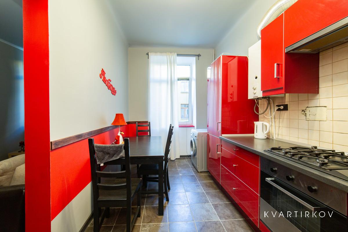 Квартира находится в старинном здании на 3 этаже (есть лифт). В подъезде ведется видеонаблюдение. Это небольшая, но очень уютная, с высокими потолками, только что полностью отремонтированная квартира в современном минималистском стиле. В спальне есть двуспальная кровать, шкаф-купе, комод с зеркалом и выход на балкон.