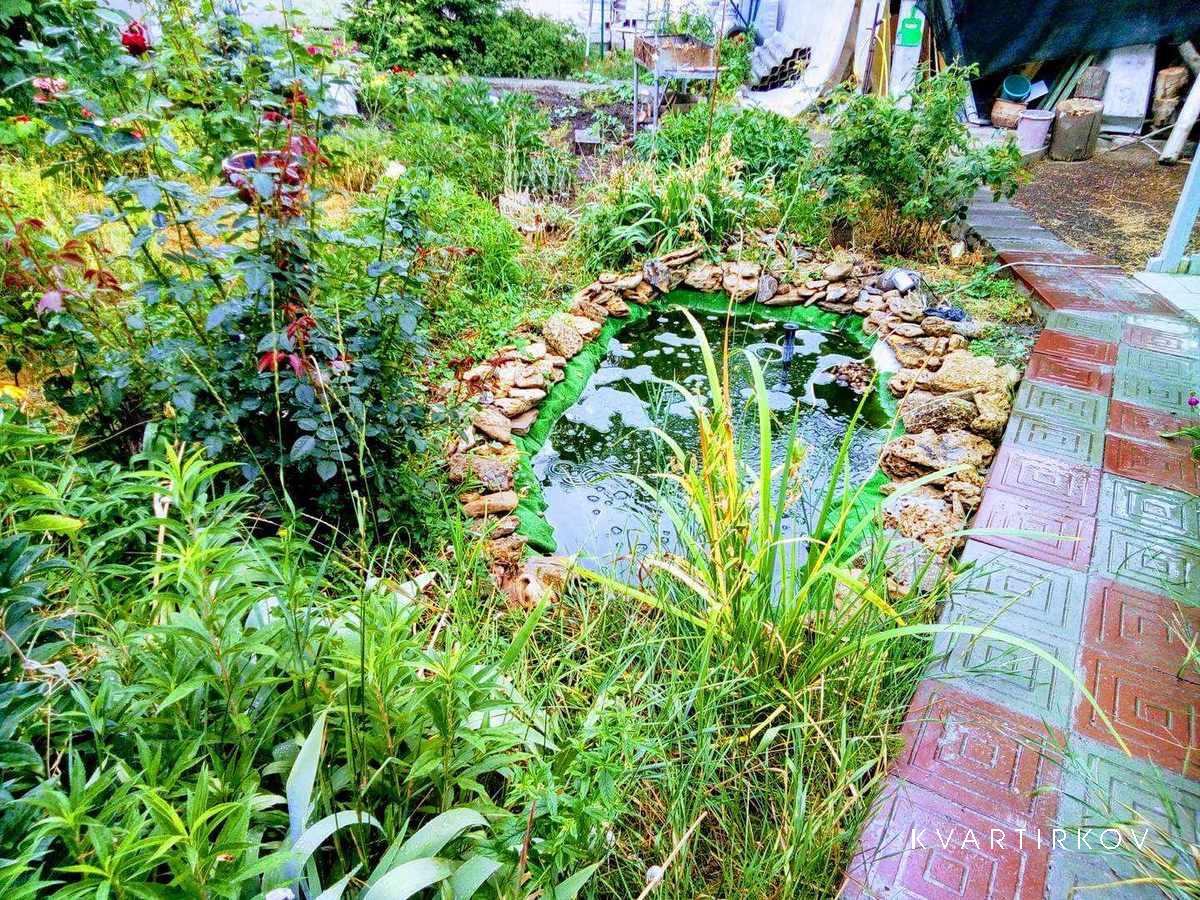 Красивый зелёный двор в цветах с беседкой и мангалом, пруд, качели.