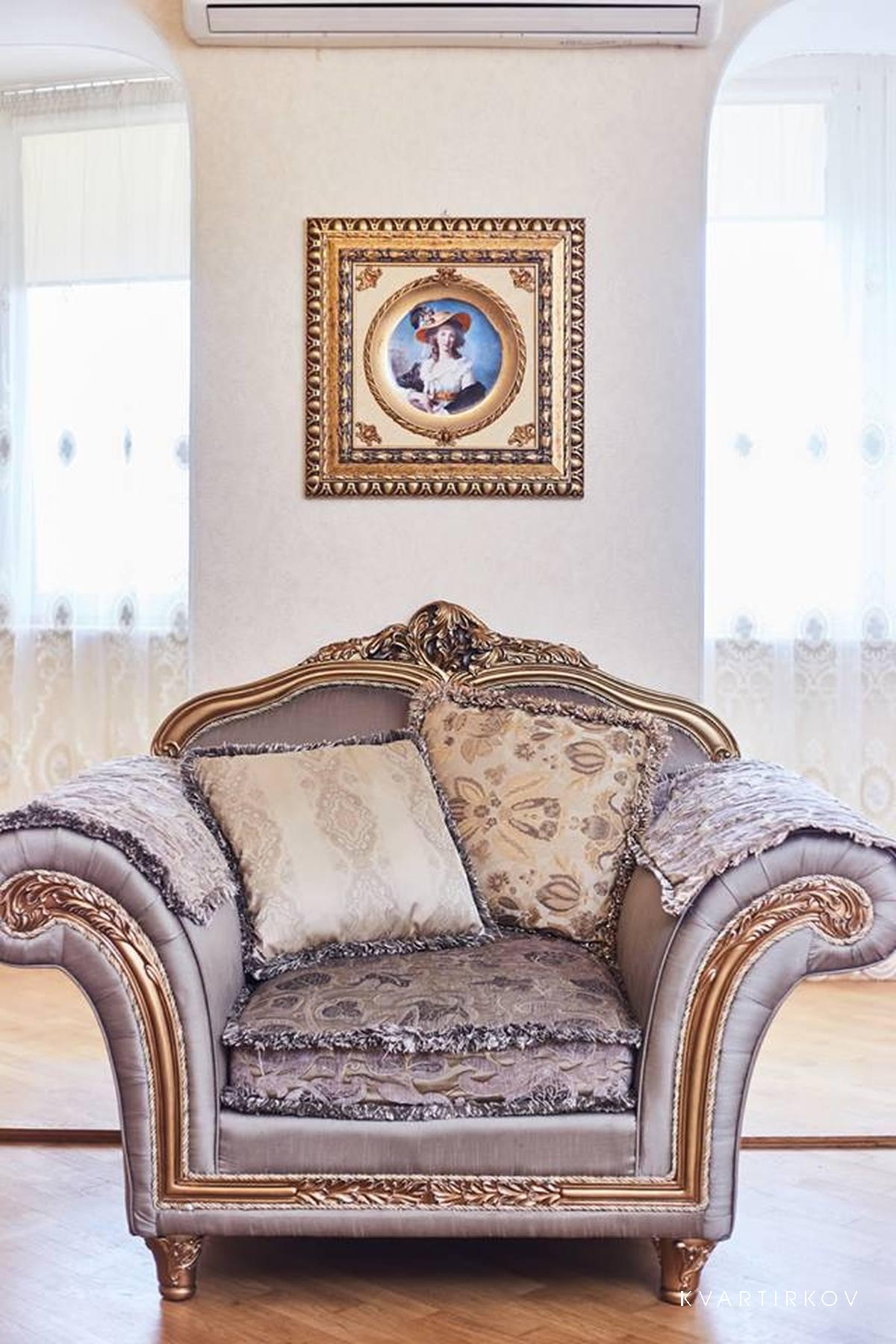 На двери установлен код защиты, принцип сейфа. Паркетные полы. Вся деревянная мебель покрыта сусальным золотом. В наличии 2 туалета. В ванной комнате раковина, не имеющая аналогов, выполнена из натурального оникса и сусального золота. Главный сюрприз для гостей - по старым семейным фотографиям я воспроизвела интерьер гостиной 1902 года. Мраморный камин с лепниной, старинный торшер из бронзы, картины в рамах из сусального золота, поразительные часы, хрустальная люстра в виде свечей. Точная копия антиквариата. Говорят, что все легенды уже прошли Одессу. Я не согласна с вами. Легенды для гостей сделаны нами одесситами. Добро пожаловать в мою квартиры и наш город.