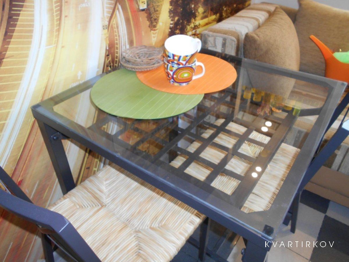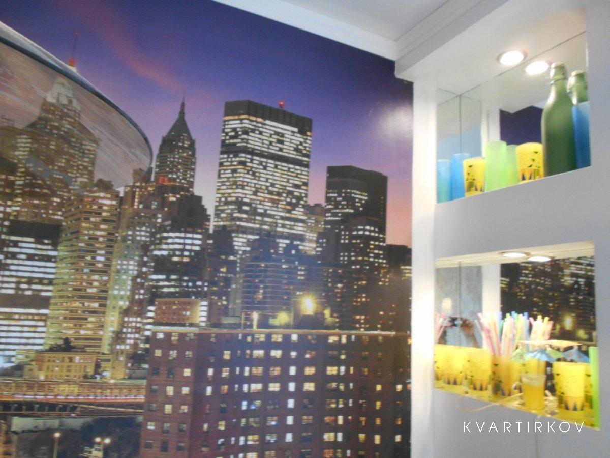 На кухне раскладной односпальный диван, на всю стену фото-обои, встроенная мебель, двухкамерный холодильник, микроволновая печь, обеденный стол, кухонная посуда в ассортименте, чай, кофе.