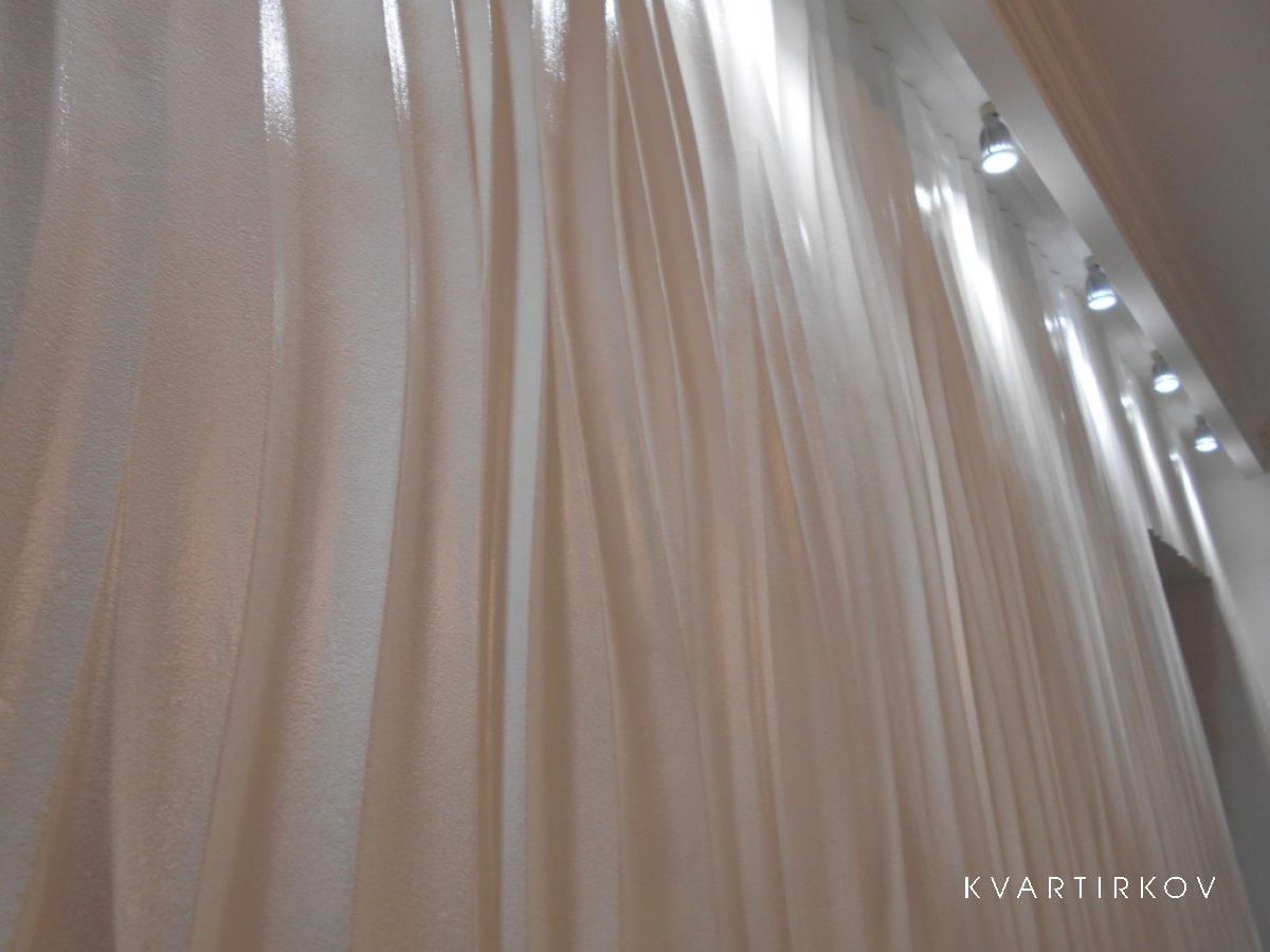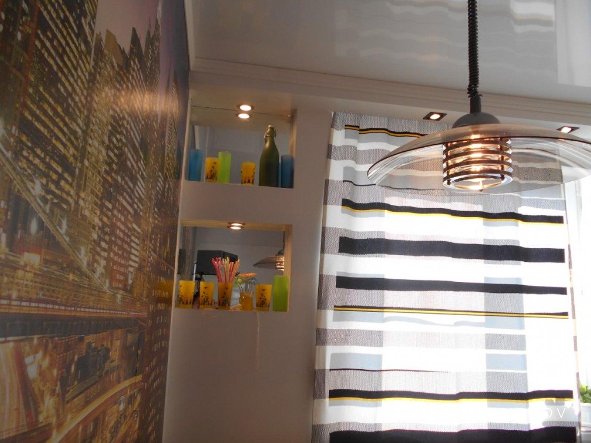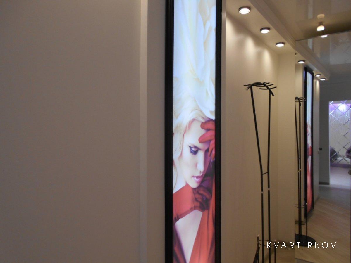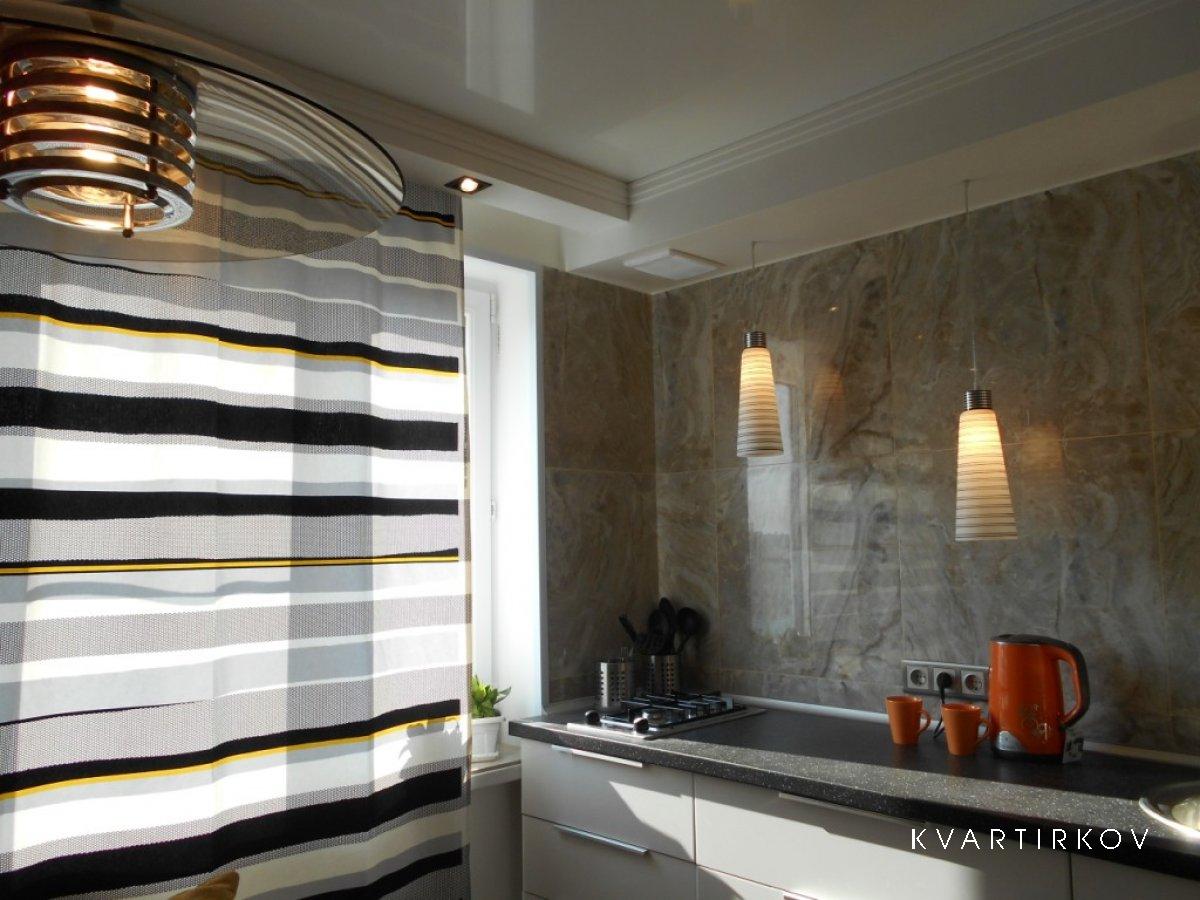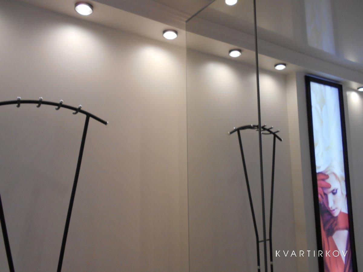 В кухне и коридоре натяжной глянцевый потолок «Каре Нуар». Закарнизная подсветка.