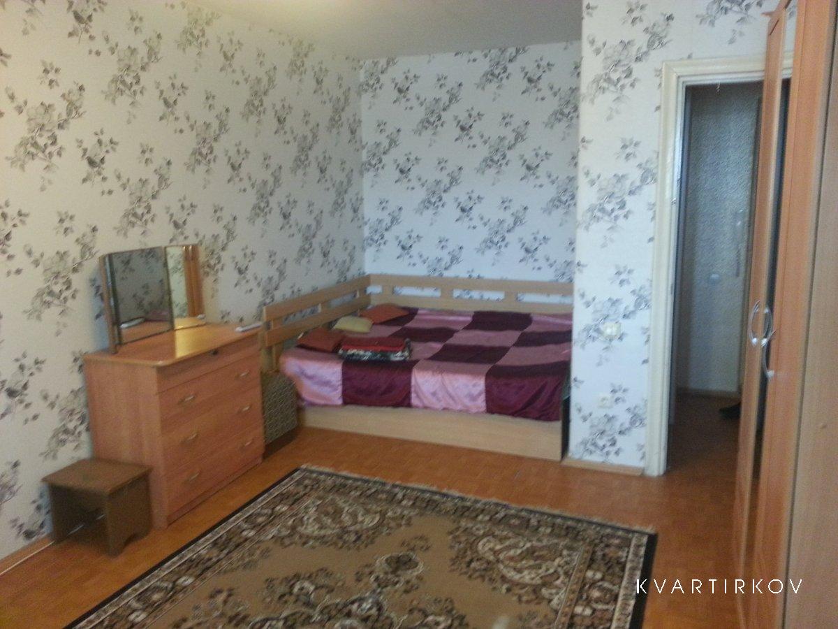1 комн. кв-ра. Спальный район города. Ухоженная, уютная, домашняя обстановка со всем необходимым: мебель, бытовая техника: плита, холодильник, телевизор, СВЧ-печь, утюг. Рядом ночные магазины, супер маркеты, автостоянки, транспортная развязка почти во все районы города.