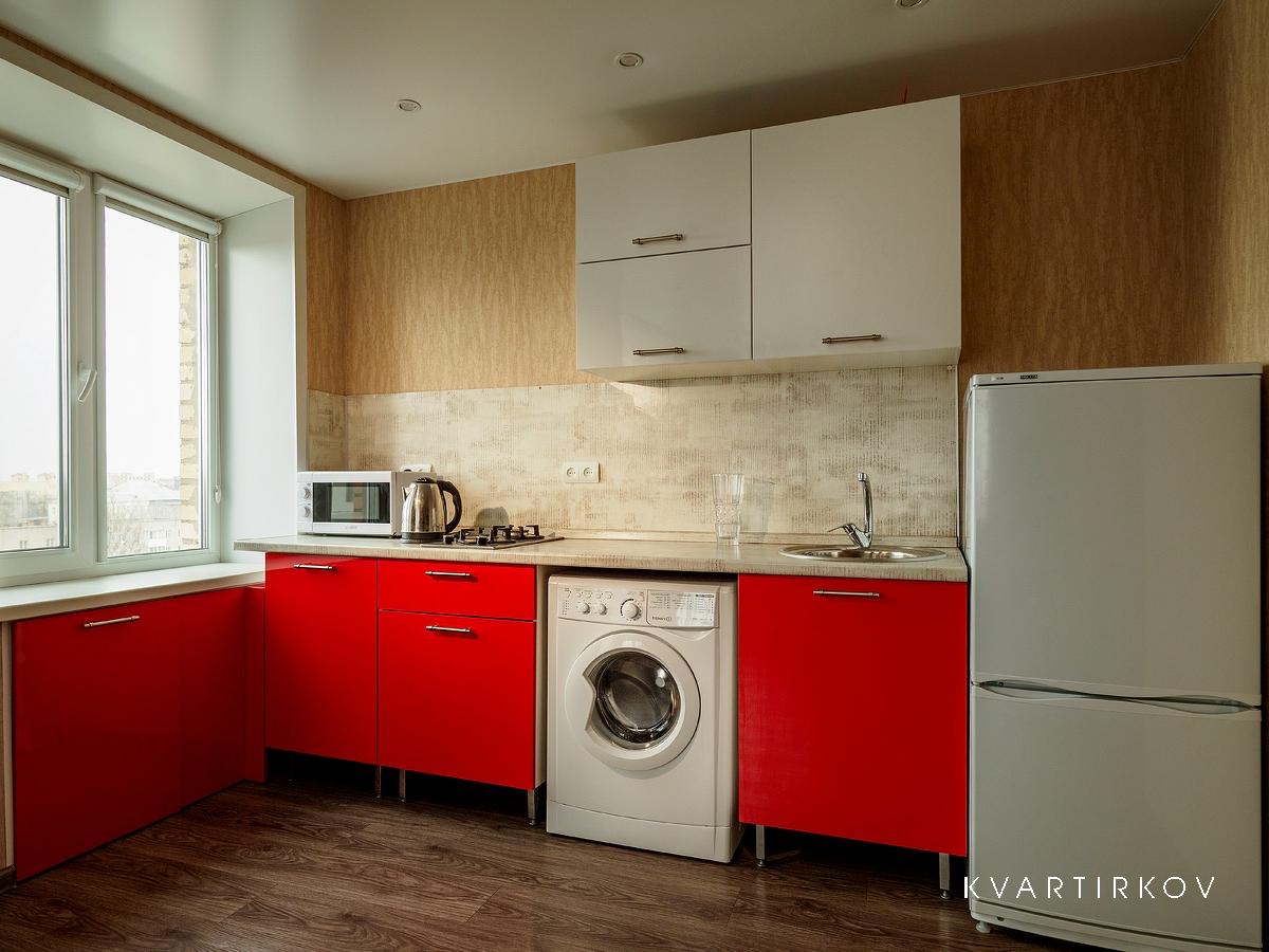 Компактная кухня оборудована современной мебелью и всей нужной для длительного проживания бытовой техникой. В распоряжении гостей квартиры полный комплект посуды и кухонной утвари на четыре персоны, чтобы чувствовать себя как дома и готовить привычный рацион по своему вкусу.