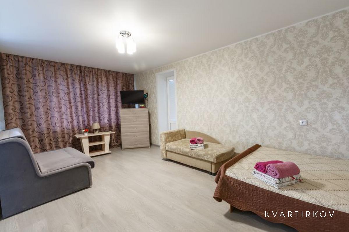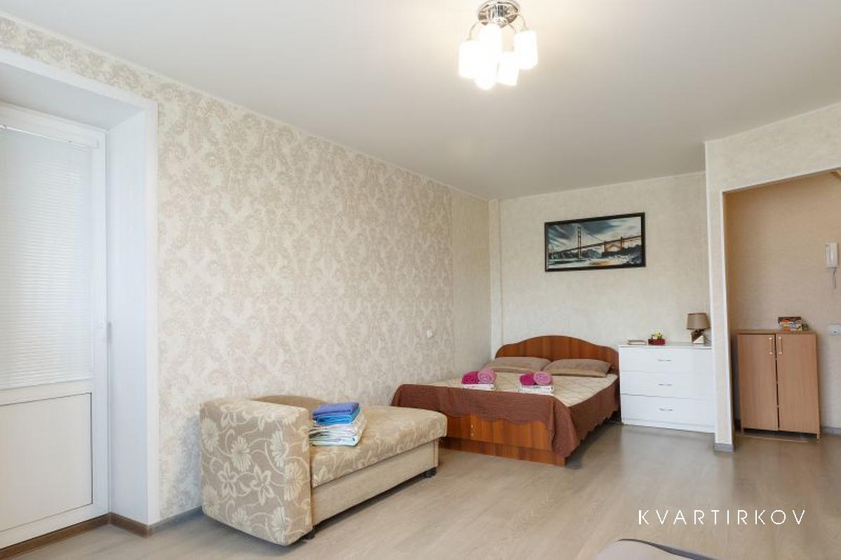 Новая квартира студия, яркий стильный интерьер и удобное расположение. Большая двуспальная кровать, большой двуспальный диван, односпальная тахта, пять спальных мест.