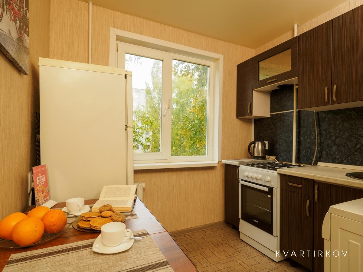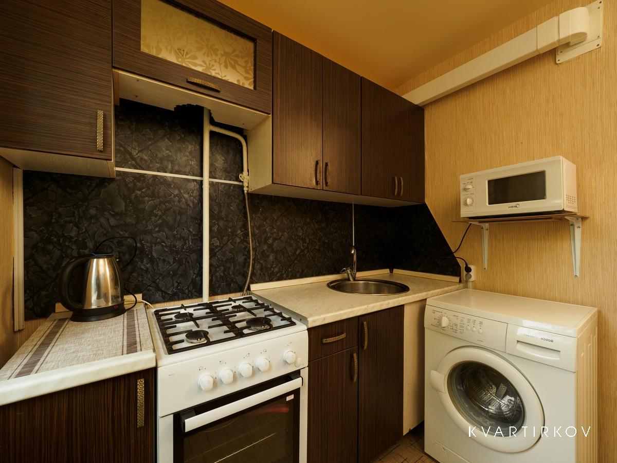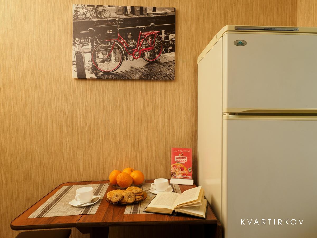 Компактная кухня оборудована современной мебелью и всей нужной для длительного проживания бытовой техникой. В распоряжении гостей квартиры полный комплект посуды и кухонной утвари на четыре персоны, чтобы чувствовать себя как дома и готовить привычный рацион по своему вкусу.