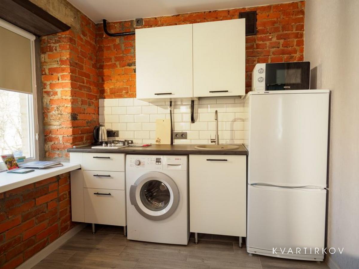 Компактная кухня оборудована современной мебелью и всей нужной для длительного проживания бытовой техникой. В распоряжении гостей квартиры полный комплект посуды и кухонной утвари на четыре персоны, чтобы чувствовать себя как дома и готовить привычный рацион по своему вкусу.