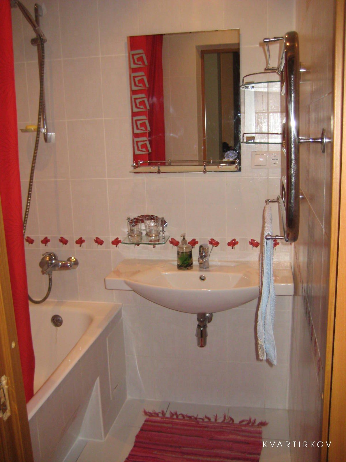 В ванной комнате: ванна, раковина, зеркало, одноразовые средства гигиены, полотенца.