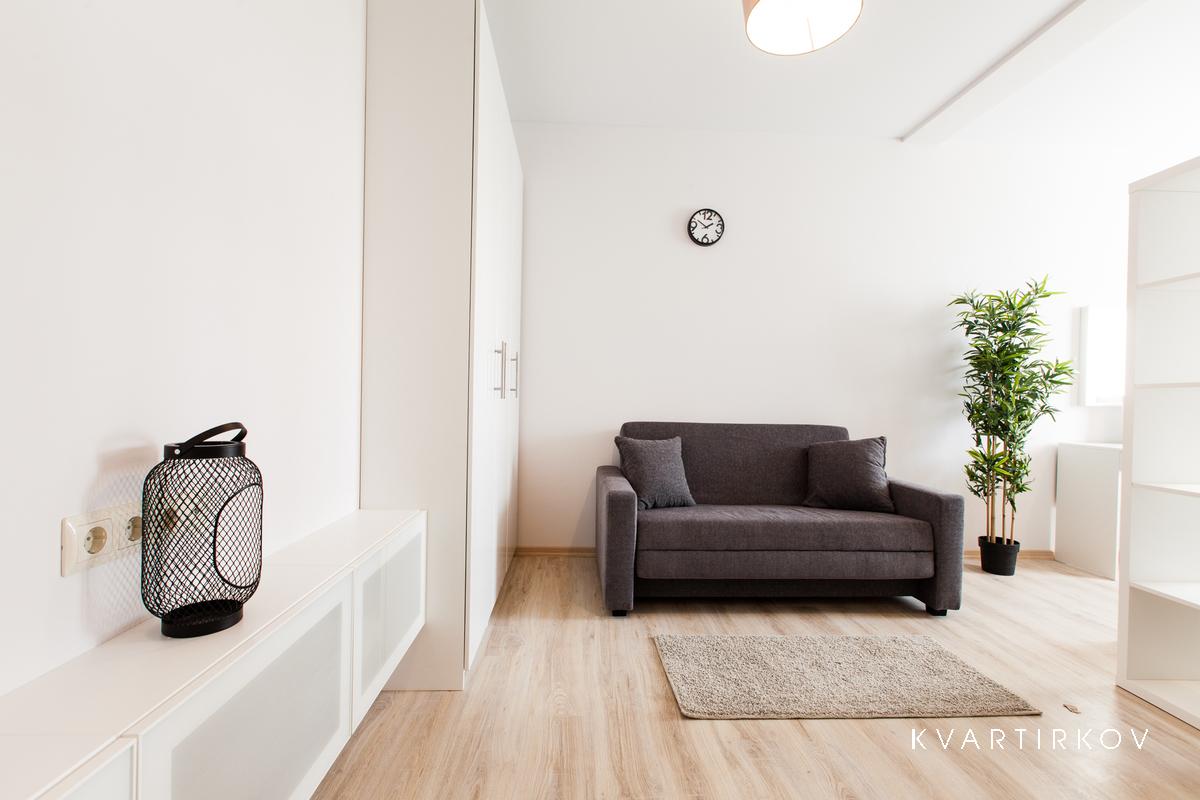 Гостиная разделена на 2 зоны функциональной перегородкой - стеллажом, дополненным приятными деталями и аксессуарами.