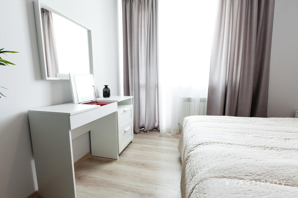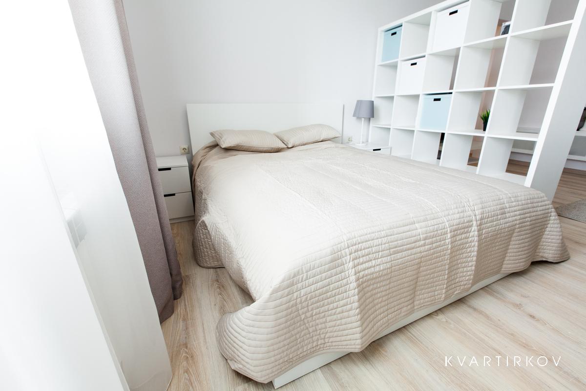 Спальня укомплектована огромной кроватью с ортопедическим матрасом.