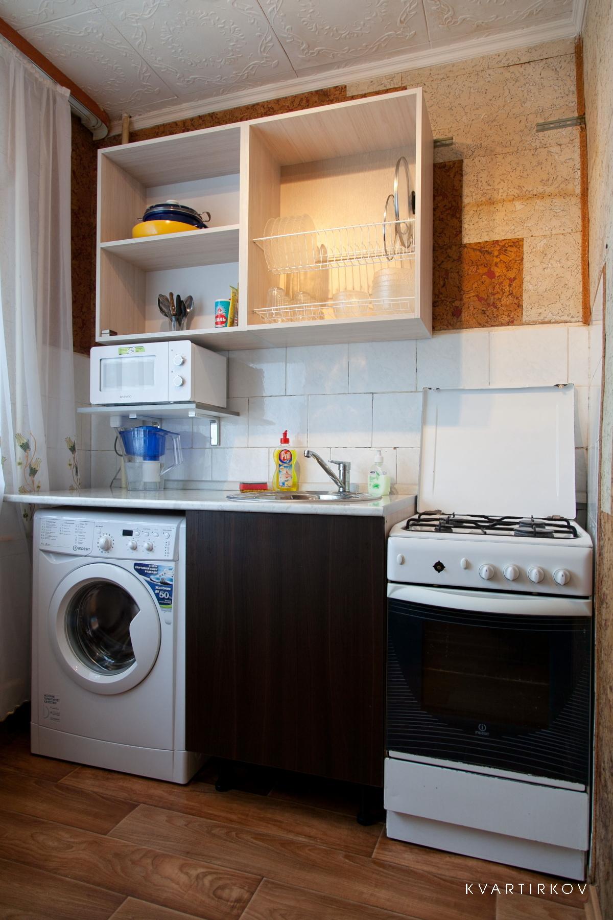 На кухне есть все для приготовления вкусного ужина: плита, кастрюли, сковородки, микроволновка, чайник.