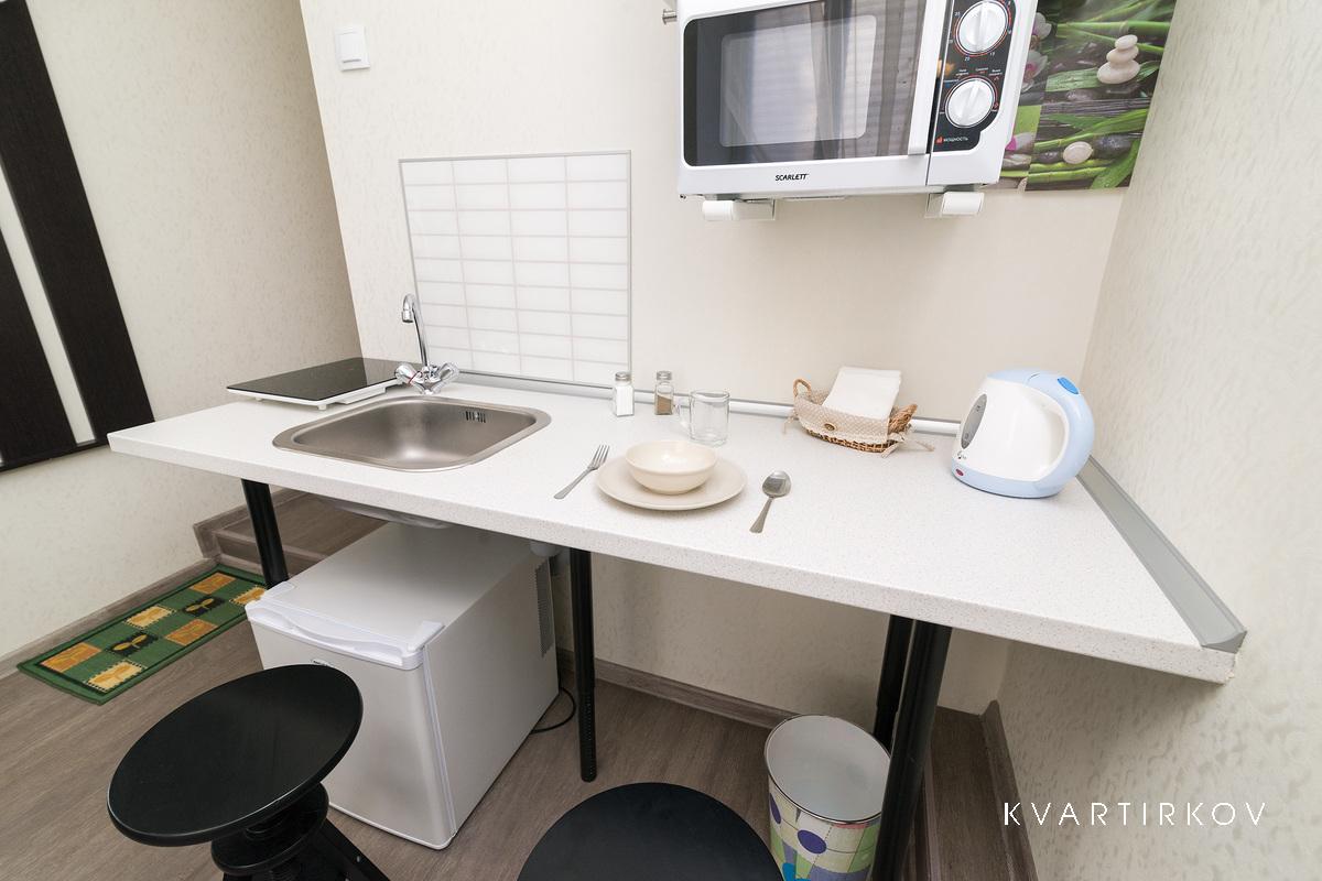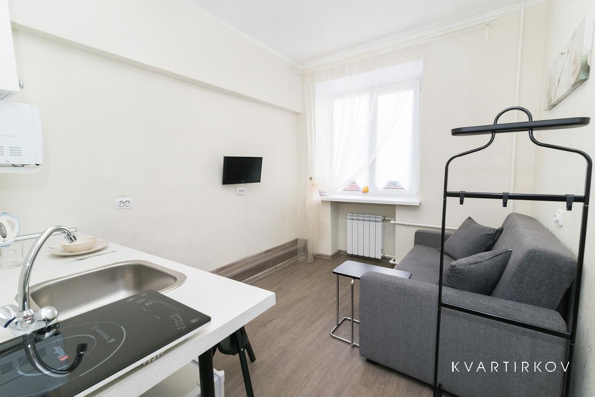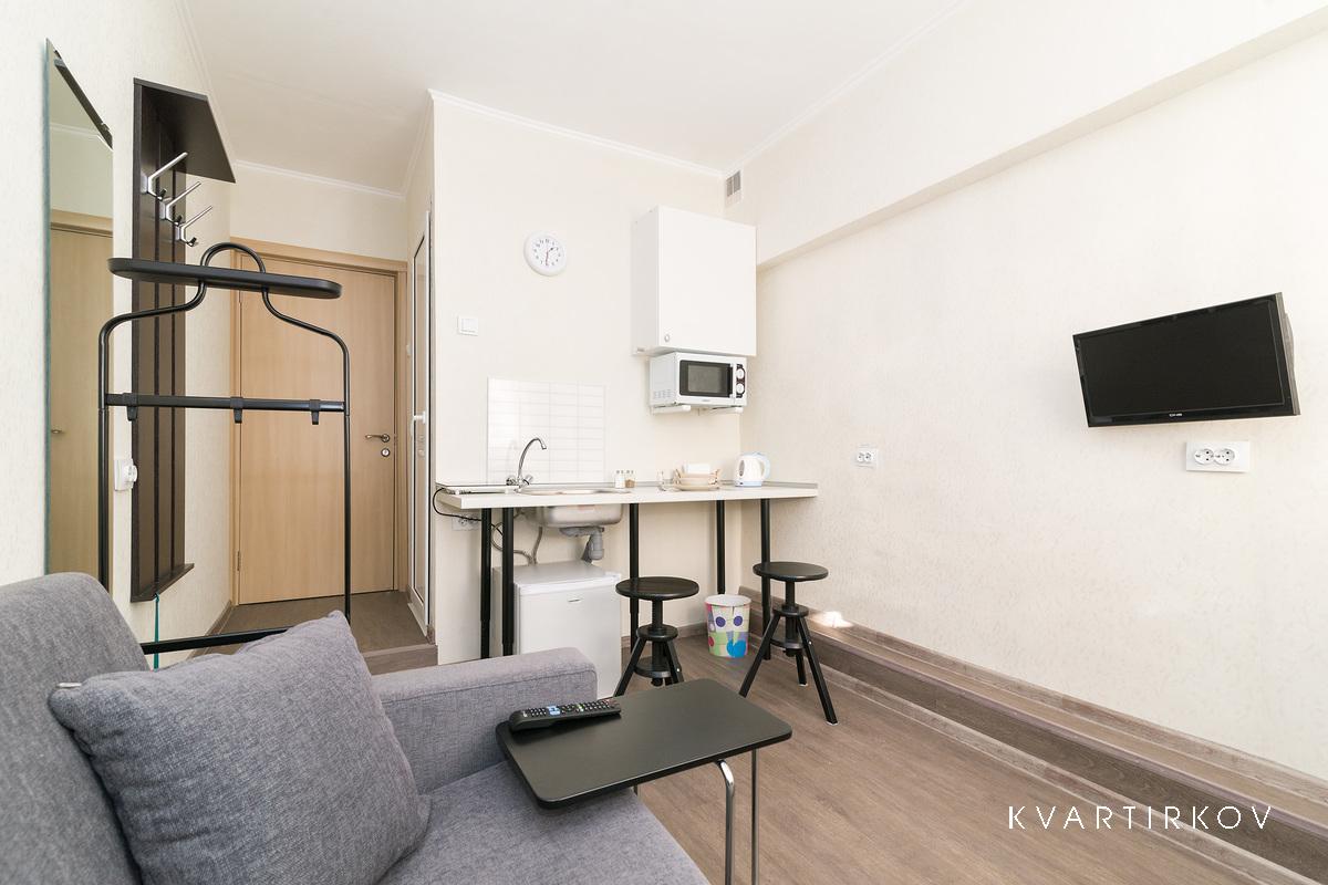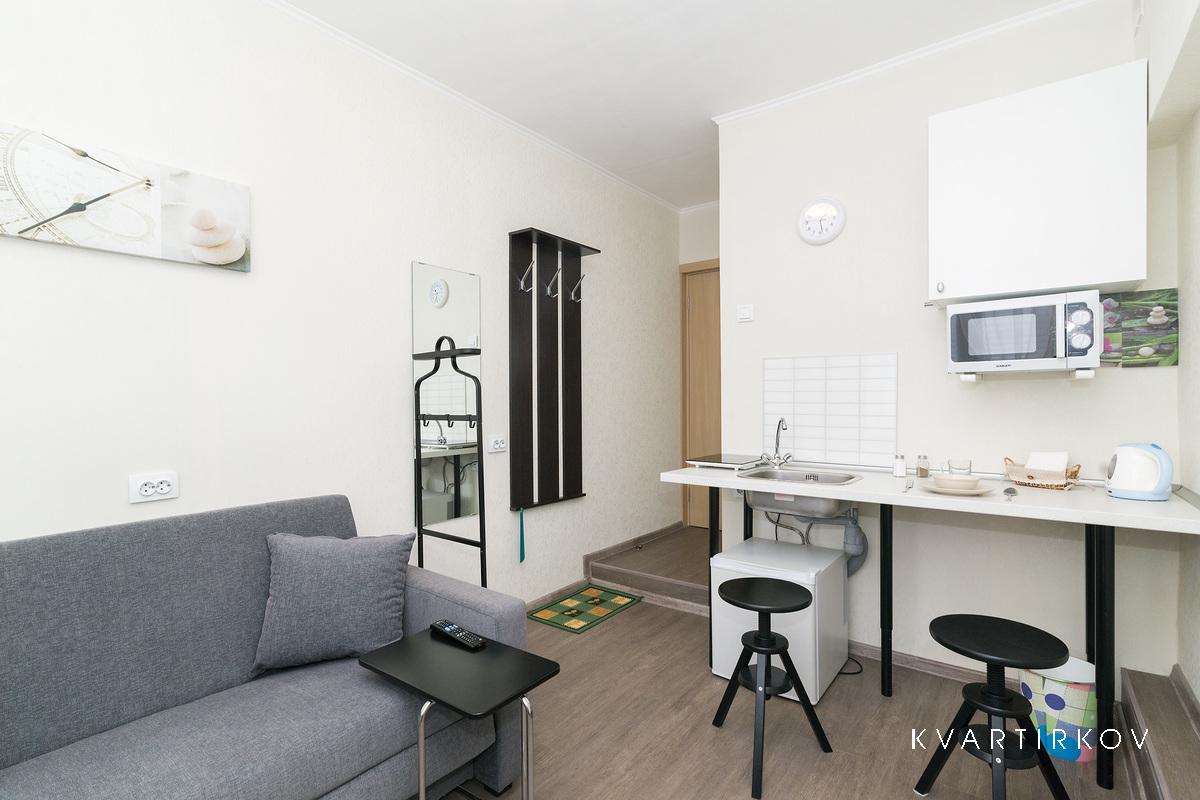 Здаємо студії, в яких зроблений сучасний ремонт, зручна обстановка. Дві хвилини ходьби до зупинок громадського транспорту в будь-яку точку міста. До послуг гостей надається: безкоштовний WI- FI, праска, фен, цифрове ТБ. У кожній студії знаходиться два спальних місця - це зручний диван. На кухні є все необхідне для приготування їжі: електричний чайник, мікрохвильова піч, електрична плита, холодильник.