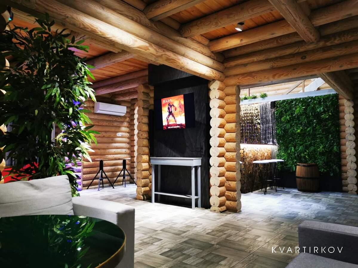 Зона відпочинку на вулиці з м'якими меблями, шезлонгами, критий великий мангал.